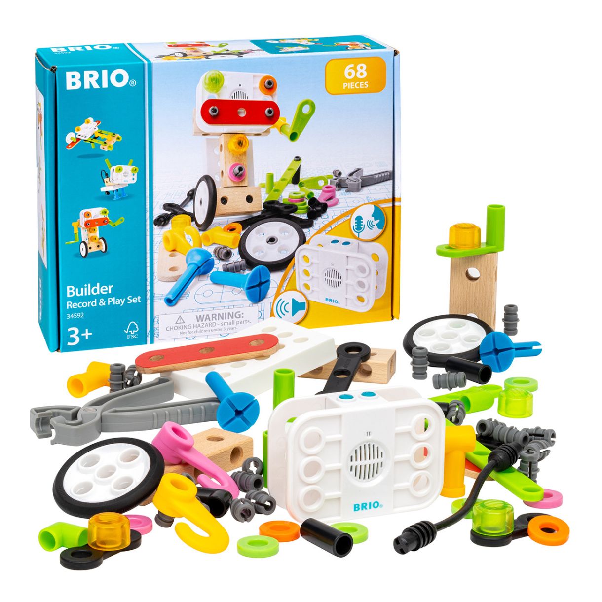 Комплектът запиши и играй на BRIO позволява на творенията на детето ви да оживеят с помощта на записани говор и звуци.Сега можете да разширите вашата система BRIO Builder до ново ниво на творчество и безкрайна игра. С този комплект от 67 части Record & Play Set можете да построите почти всичко, което пожелаете, така че оставете въображението ви да се развихри. Цветните компоненти и лесните за използване инструменти за конструиране ви позволяват бързо да построите страхотни играчки като ново превозно средство или приятелски робот.