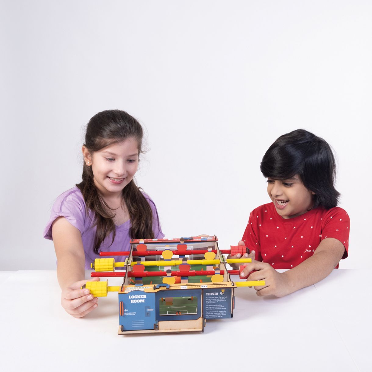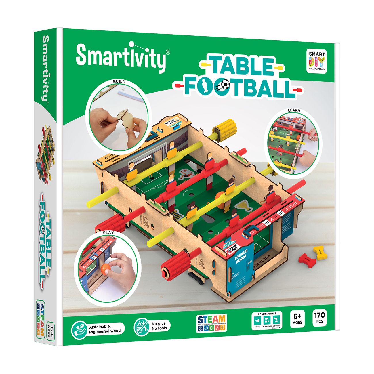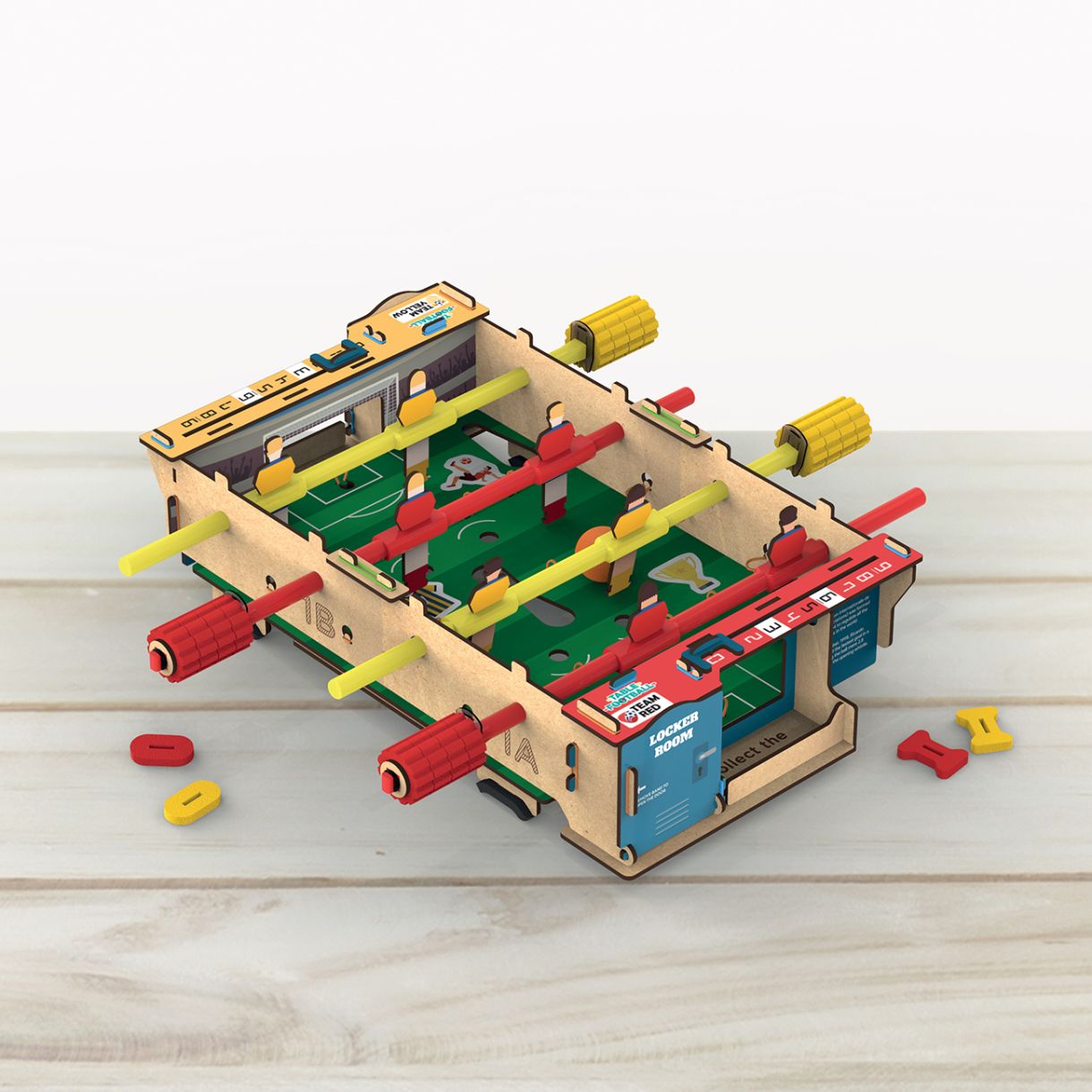 Изградете своя собствена дървена джага, като следвате лесните инструкции стъпка по стъпка. Приключили сте с изграждането? Започнете да играете! Изберете своя отбор, завъртете пръчките, за да ритате топката, и вкарайте гол! Вкарайте топката и победете противника си! Научете повече за понятията лостове, импулс, пренос и втория закон за движението на Нютон. В този комплект играчки са включени две състезателни коли Roll Racing - жълта с черни ивици и бяла с червени ивици.