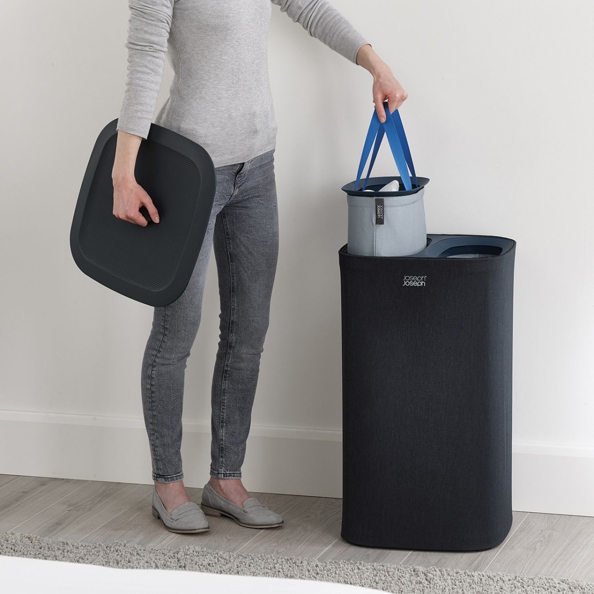 Разделете светлите и тъмните дрехи, благодарение на двете отделения на този удобен кош за пране. Tota е перфектен за спални, бани или мокри помещения. Предлага се плоско опакован с пълни инструкции за монтаж.
