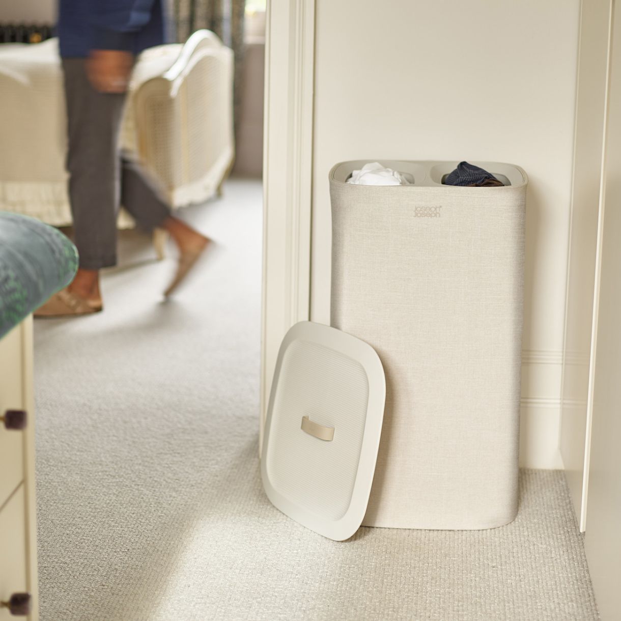 Разделете светлите и тъмните дрехи, благодарение на двете отделения на този удобен кош за пране. Tota е перфектен за спални, бани или мокри помещения. Предлага се плоско опакован с пълни инструкции за монтаж.