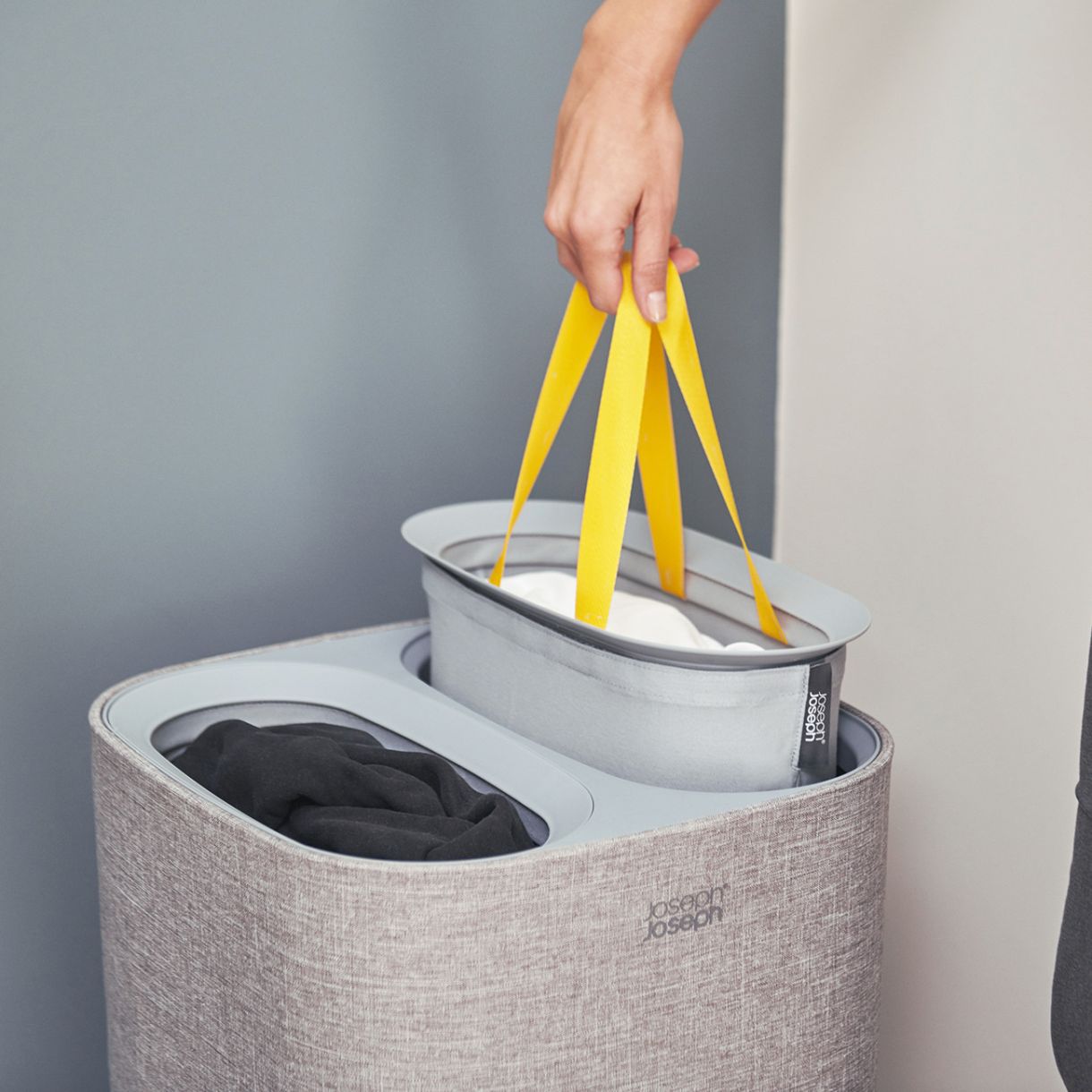 Разделете светлите и тъмните дрехи, благодарение на двете отделения на този удобен кош за пране. Tota е перфектен за спални, бани или мокри помещения. Предлага се плоско опакован с пълни инструкции за монтаж.