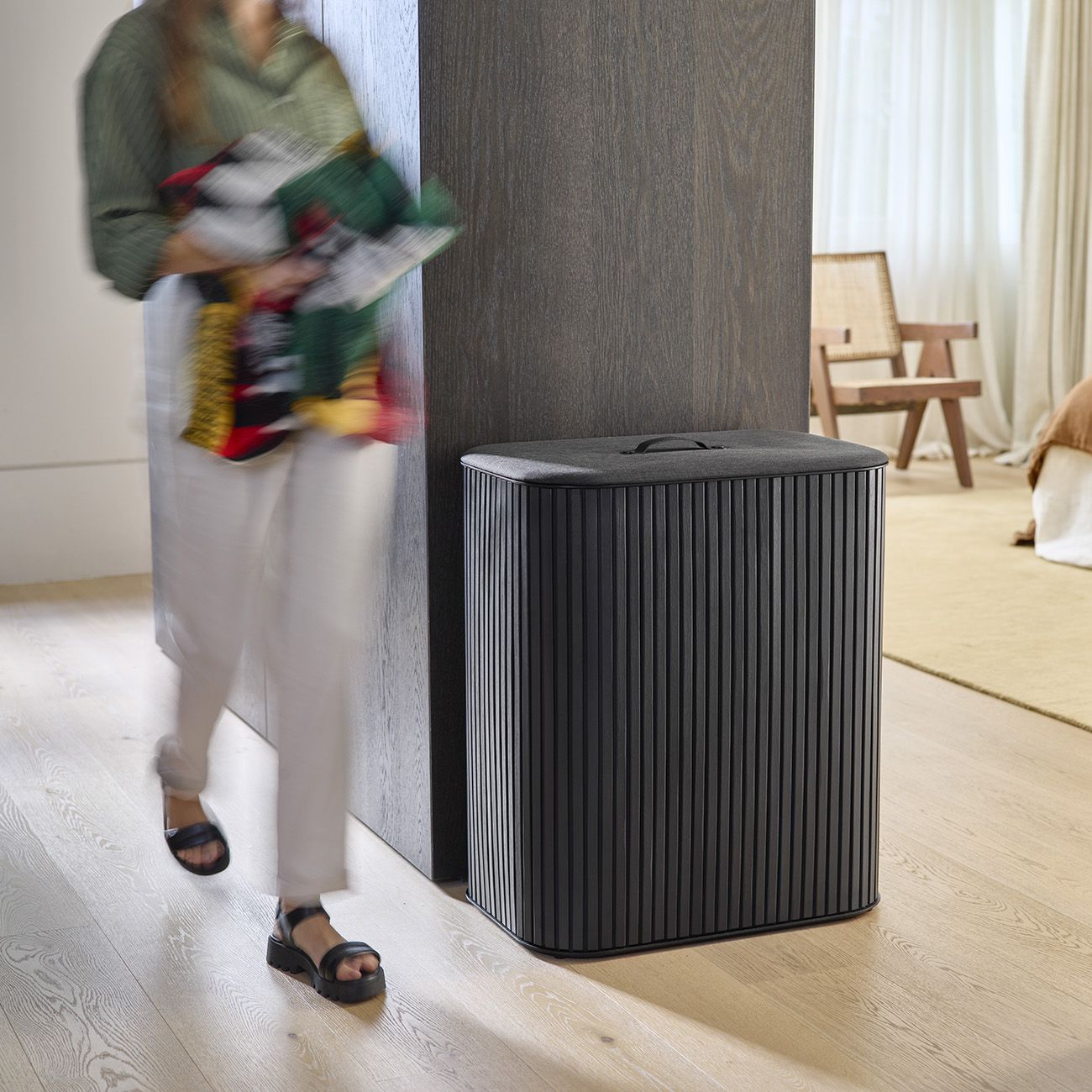 Съхранява ежедневното ви пране със стил и функционалност, с отделения за лесно сортиране и първокласно бамбуково покритие.