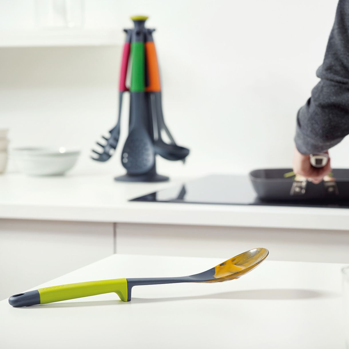Благодарение на иновативния дизайн на дръжката, може да поставите всеки един от приборите на работния плот, без да се притеснявате, че ще изцапате.