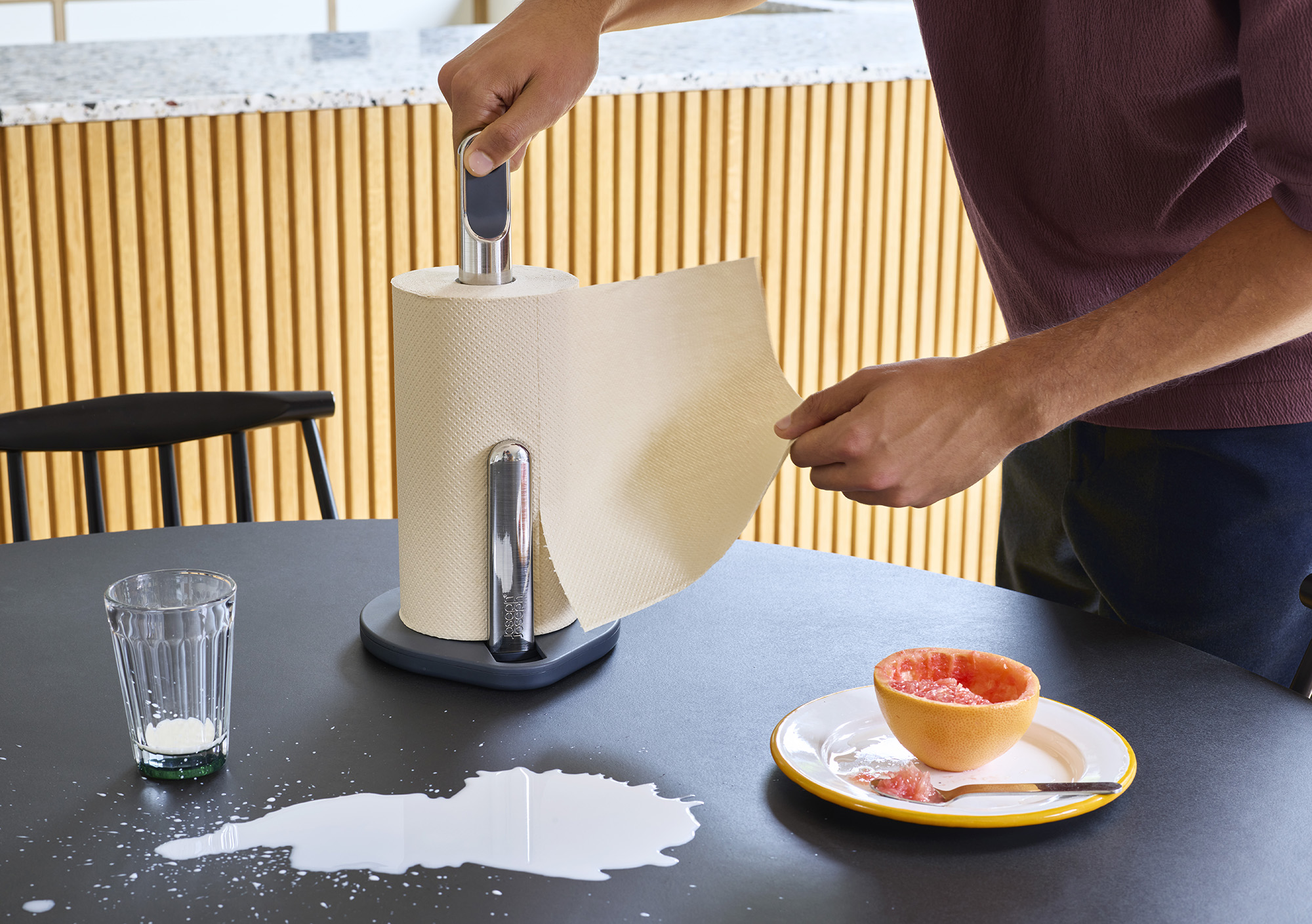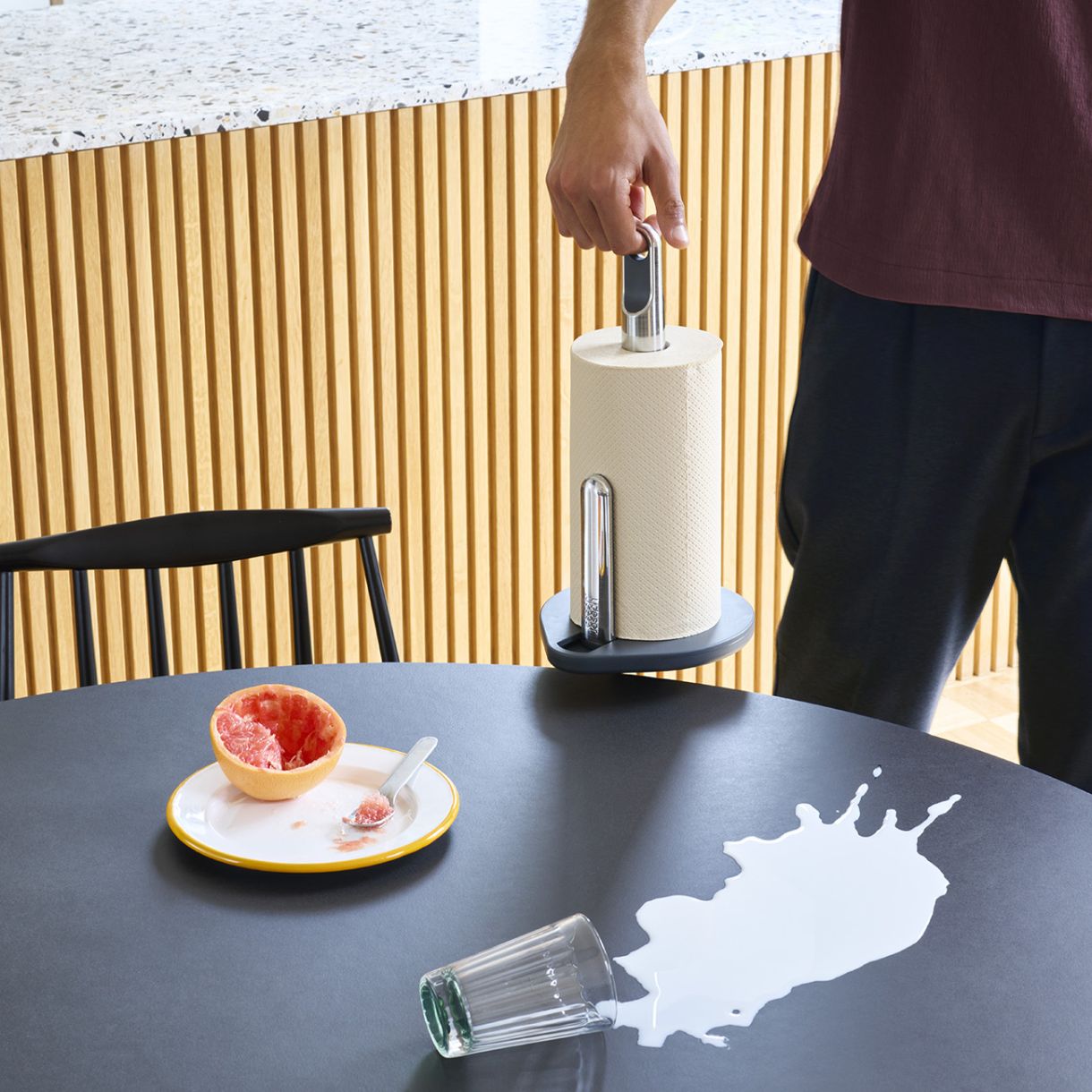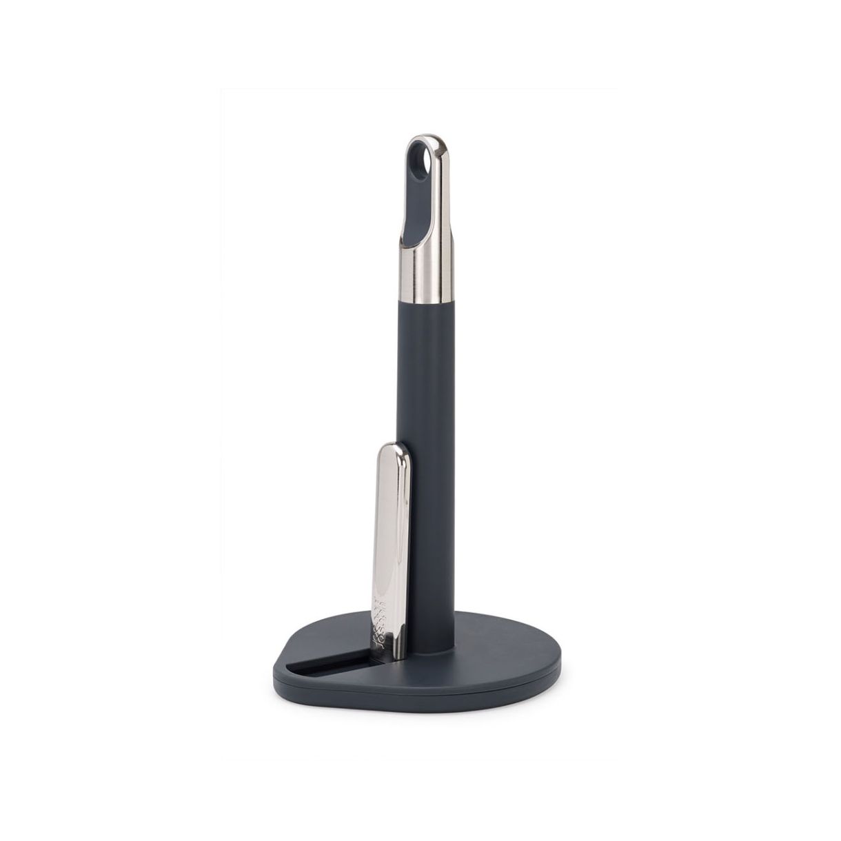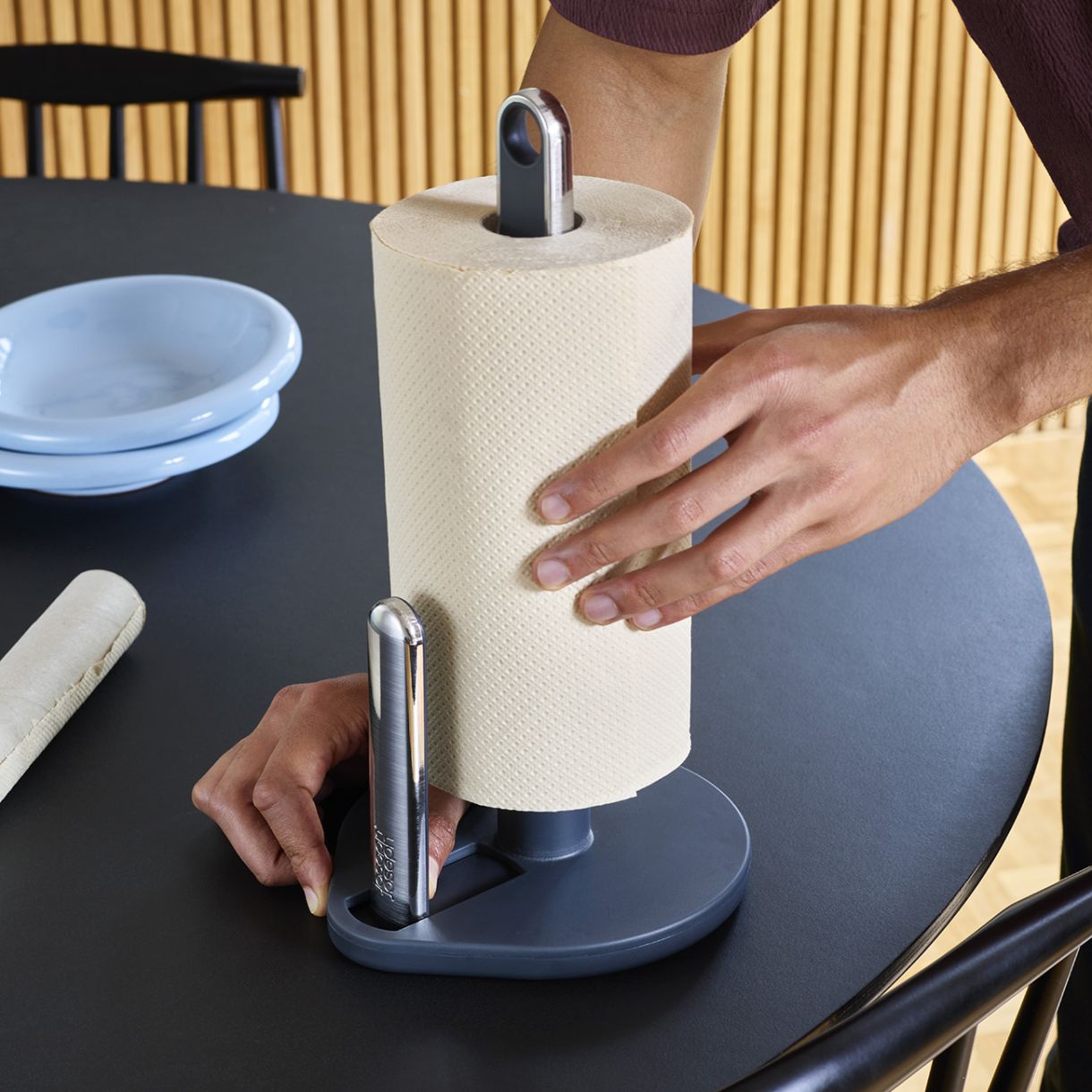 Първокласна поставка за кухненско руло с тежка основа и пружинно рамо за употреба с една ръка, плюс удобна дръжка за носене.