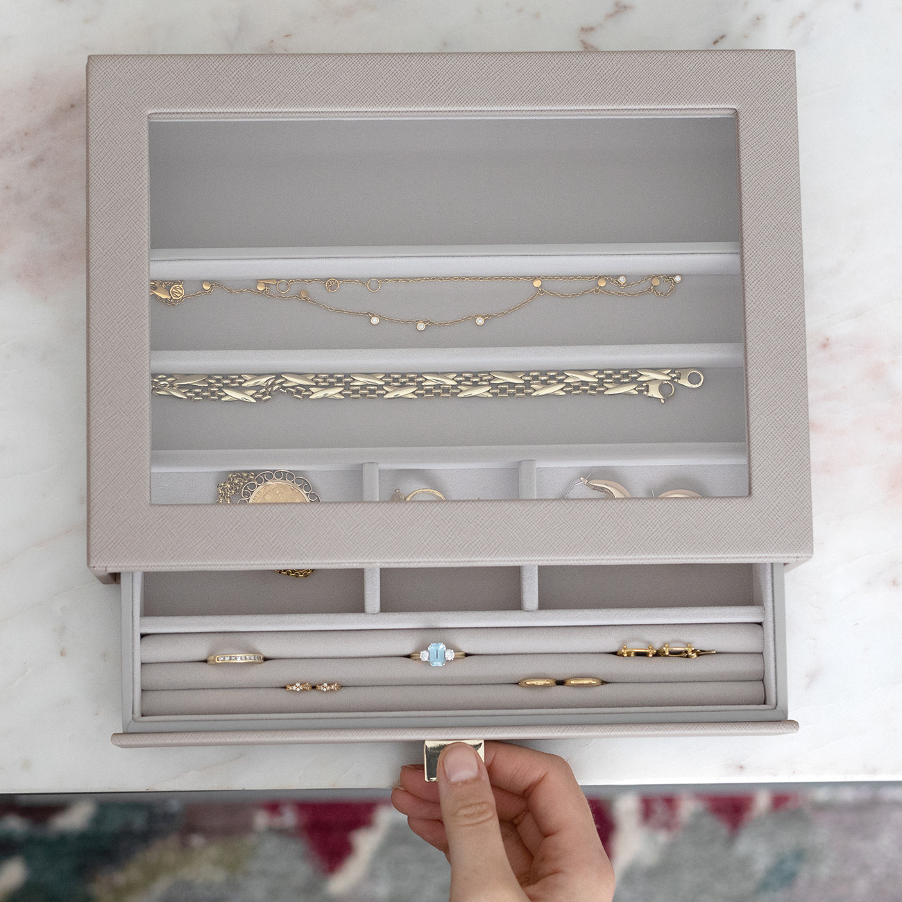 Класическата кутия с чекмедже за бижута е идеалният дом за вашата колекция от бижута. Проектирана със стъклен капак, за да покажете красиво вашите бижута, и мека кадифена подплата, за да запазите бижутата си в безопасност и защита.
