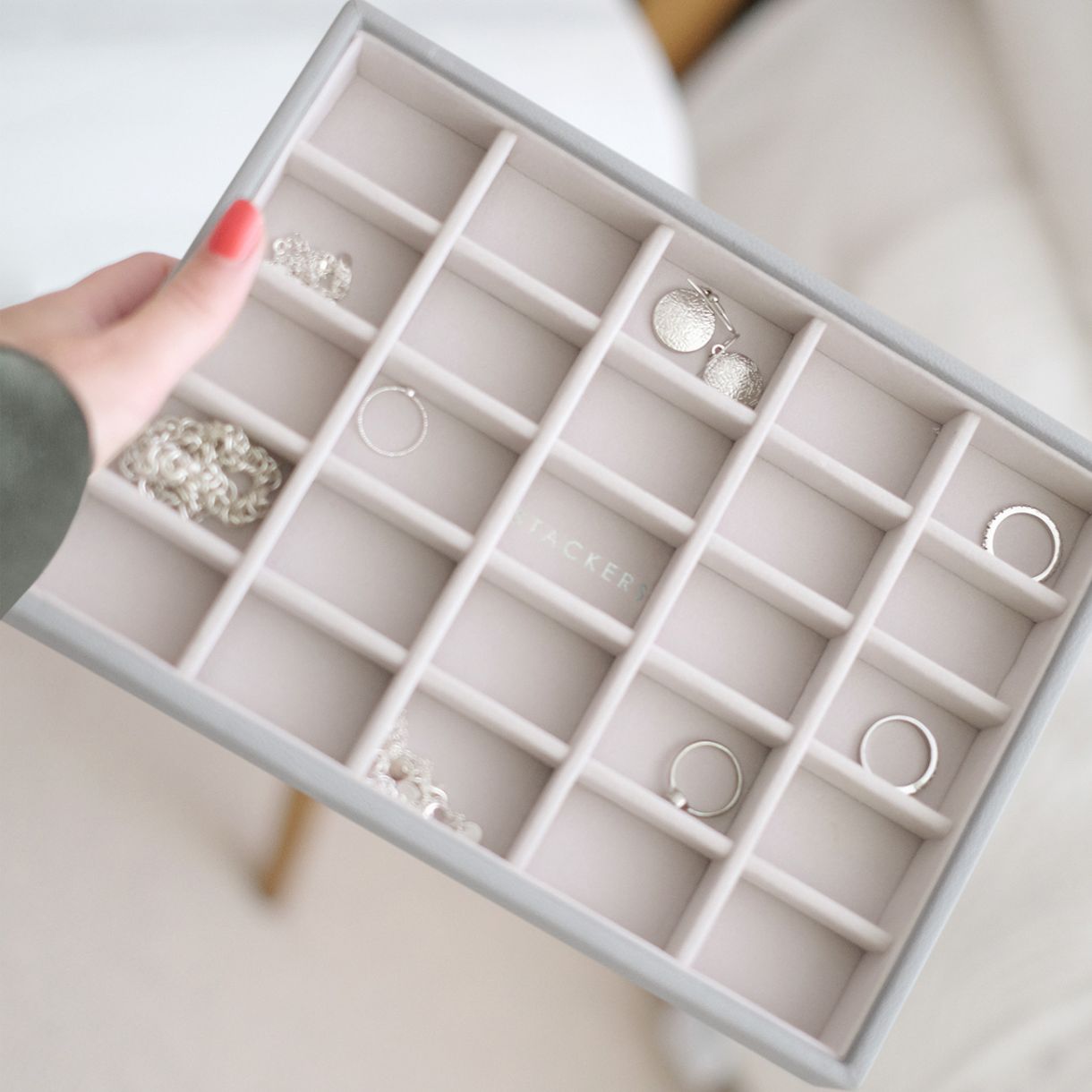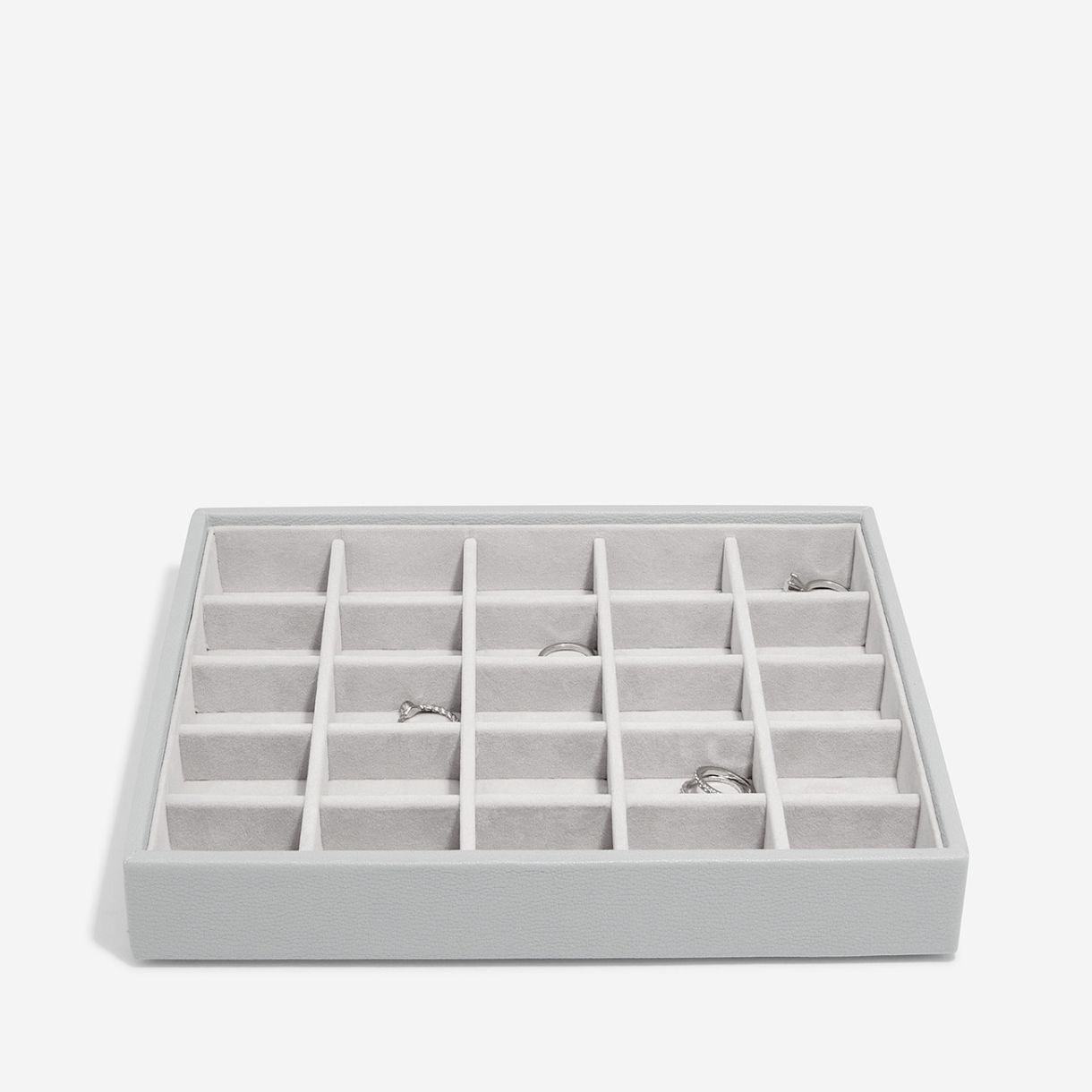 Класическа кутия за бижута на английската компания Stackers. Идеалното решение за съхранение на всичките ви обеци, пръстени и медальони. В 25 отделни секции може да съхранявате вашата колекция бижута. Кутията е изработена от еко кожа и памук. Може да се комбинира с останалите кутии без капак, както и тази с капак.