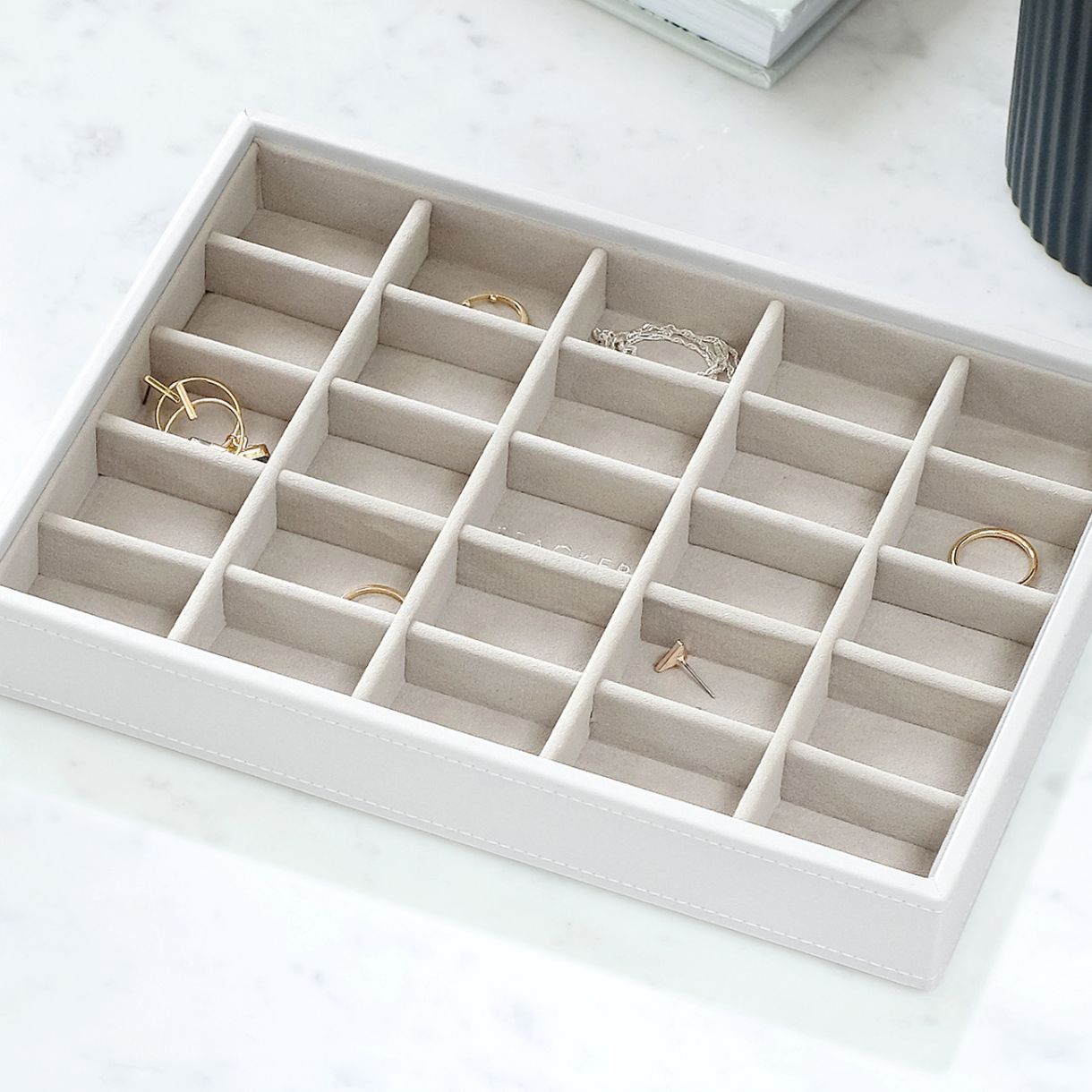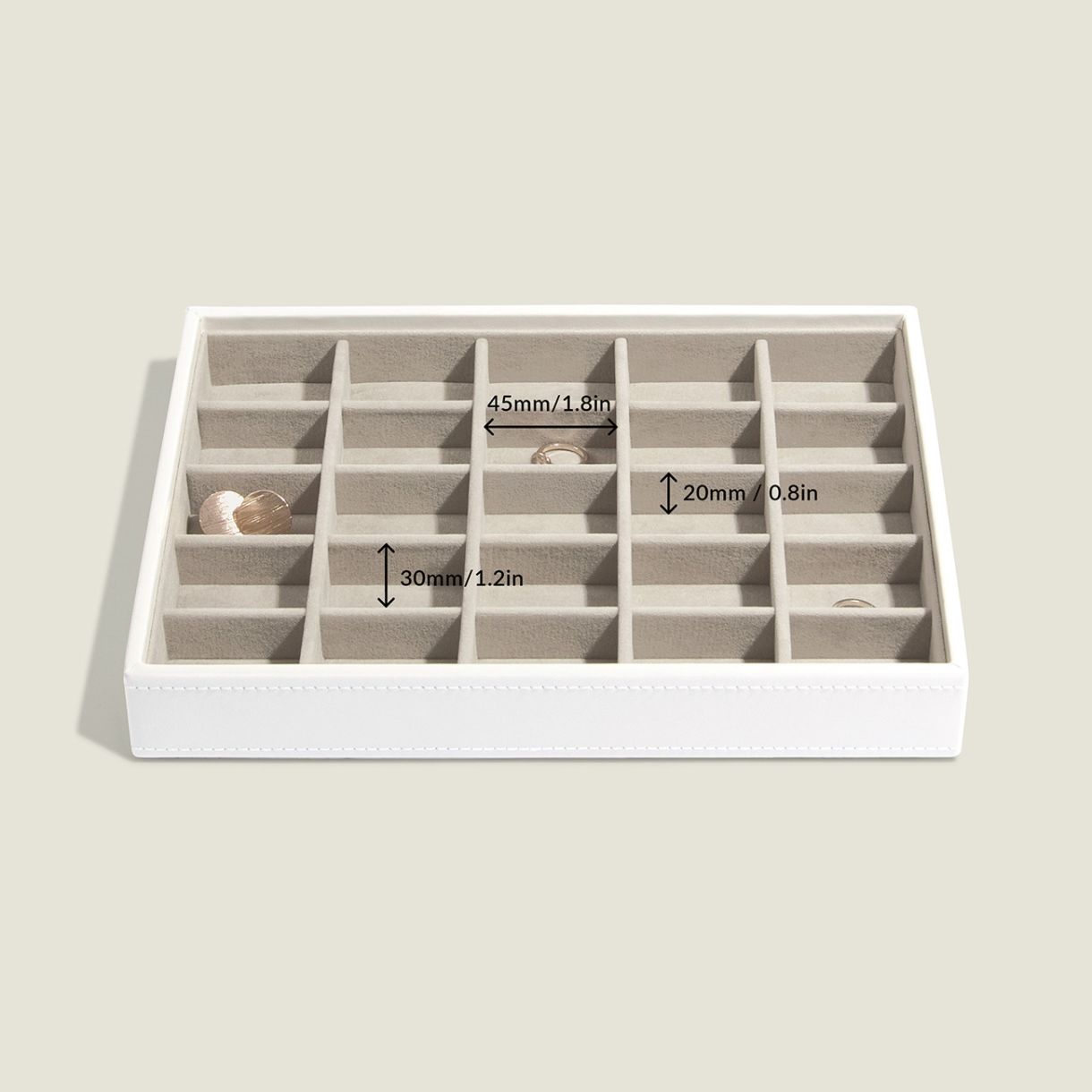 Класическа кутия за бижута на английската компания Stackers. Идеалното решение за съхранение на всичките ви обеци, пръстени и медальони. В 25 отделни секции може да съхранявате вашата колекция бижута. Кутията е изработена от еко кожа и памук. Може да се комбинира с останалите кутии без капак, както и тази с капак.