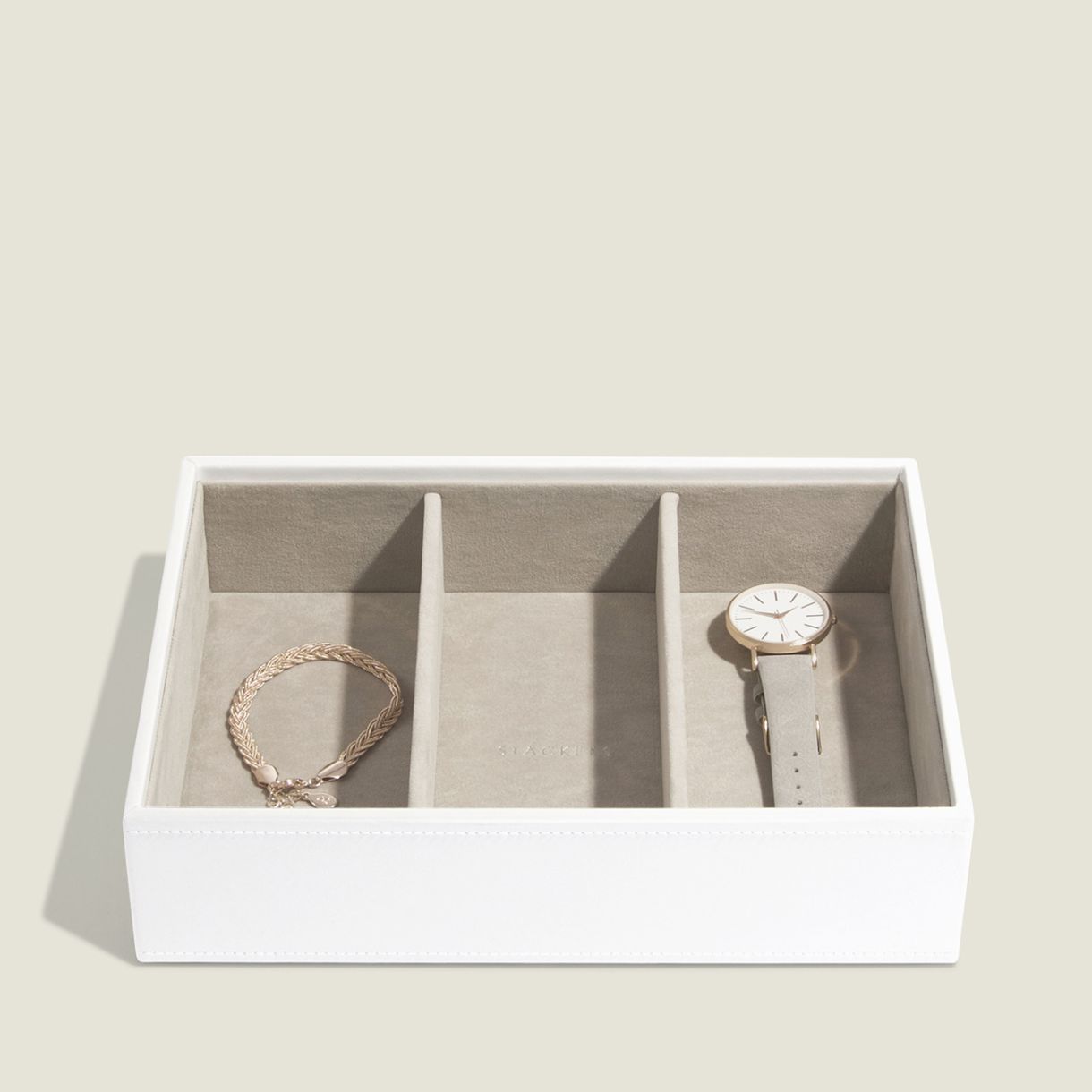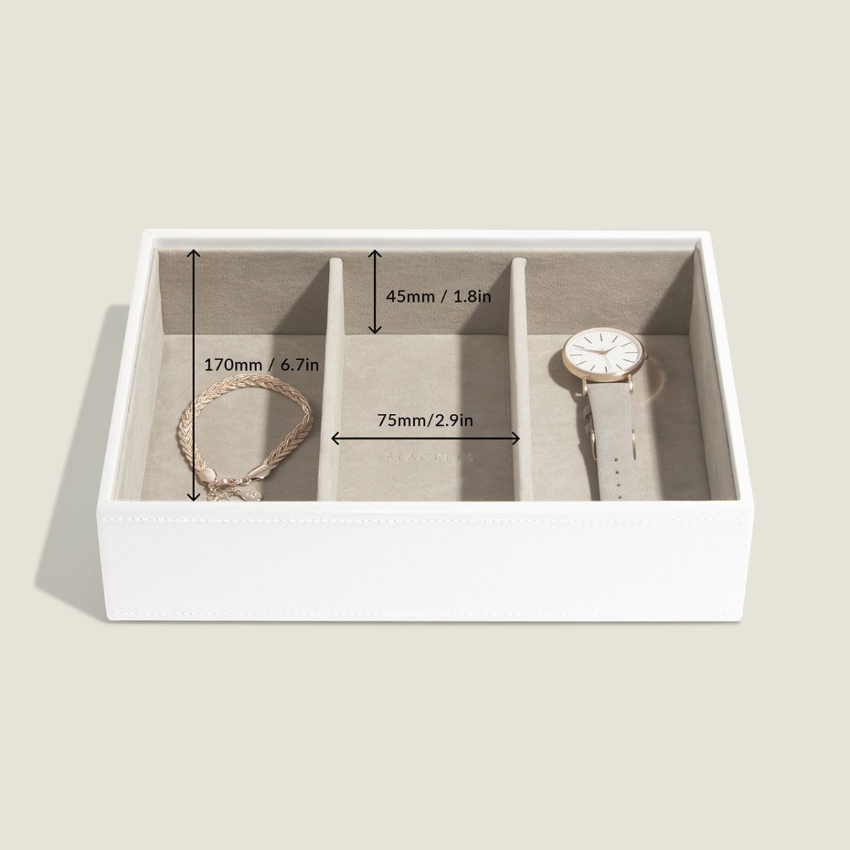 Класическа кутия за бижута на английската компания Stackers. Идеалното решение за часовници, гривни и очила. Могат да се съхраняват най-малко три чифта слънчеви очила, 6 часовника или дузина гривни. Кутията е изработена от еко кожа и памук. Може да се комбинира с останалите кутии без капак, както и тази с капак.