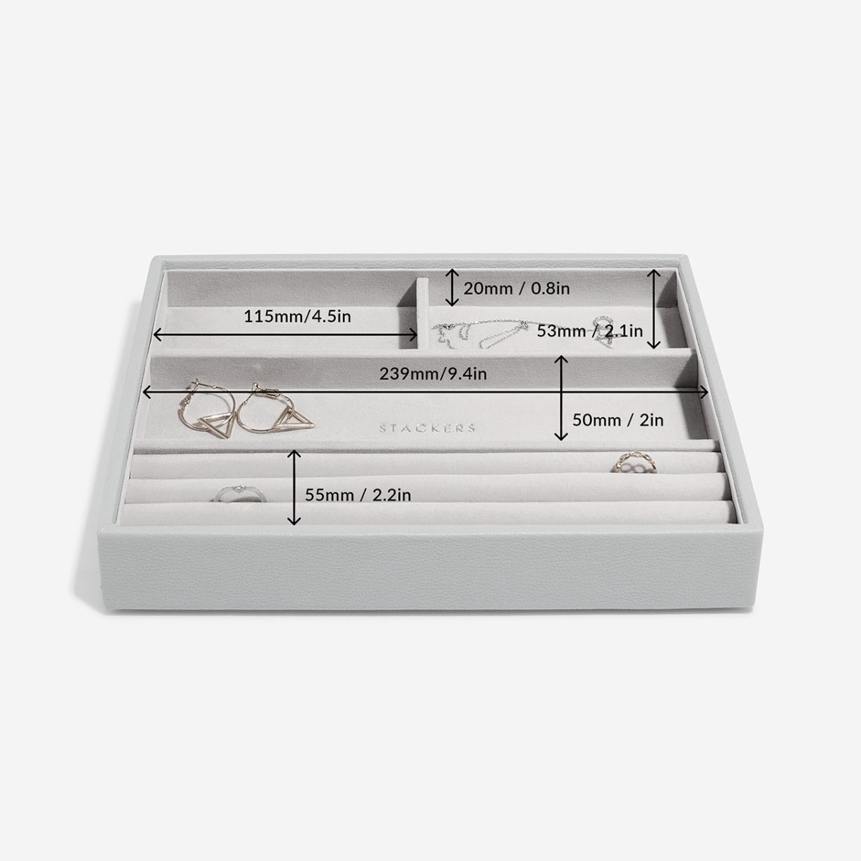 Класическа кутия за бижута на английската компания Stackers. Идеална за съхранение на гривни и колиета, както и малки обеци и пръстени в отделението за тях. Кутията е изработена от еко кожа и памук. Може да се комбинира с останалите кутии без капак, както и тази с капак.