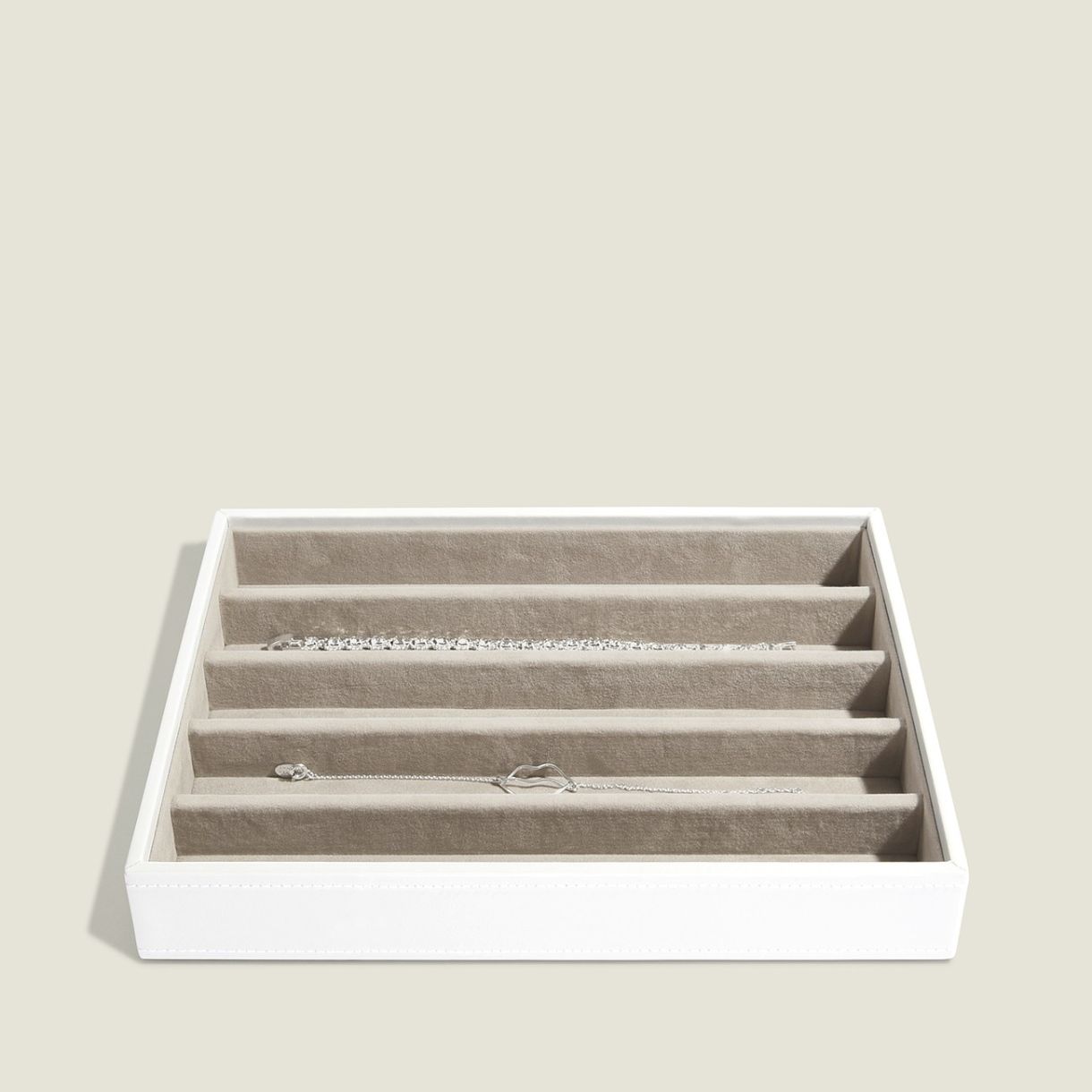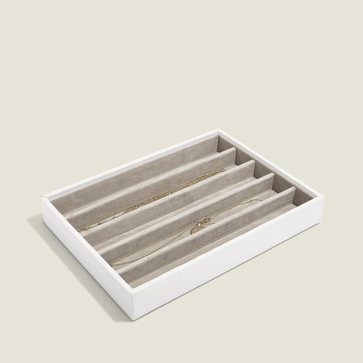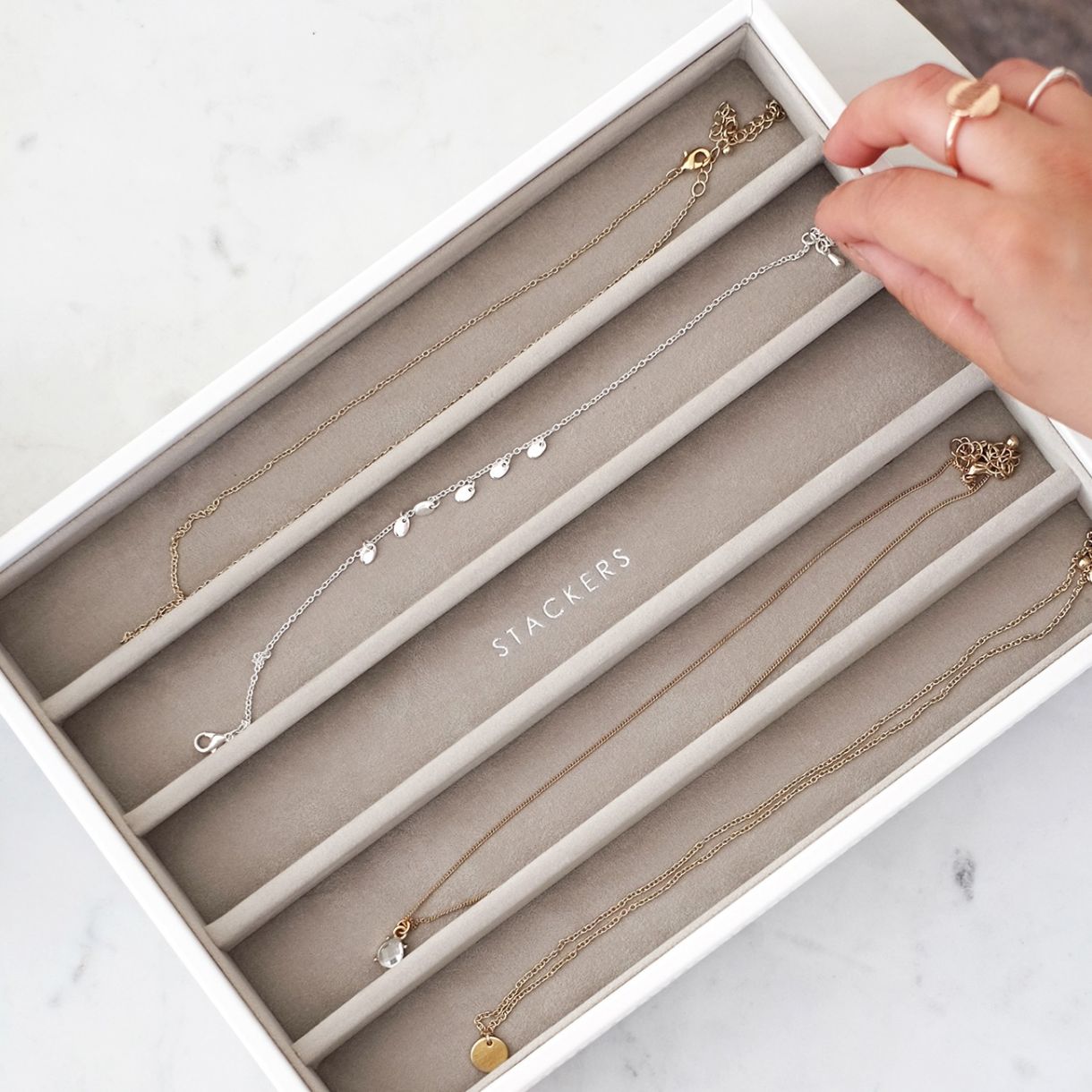 Кутия за бижута на английската компания Stackers. Идеална за съхранение на колиета и огърлици. Кутията е изработена от еко кожа и памук. Може да се комбинира с останалите кутии без капак, както и тази с капак.