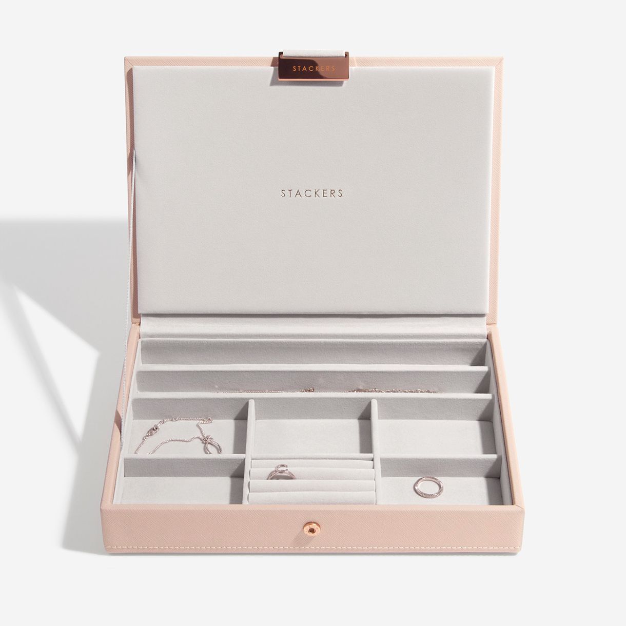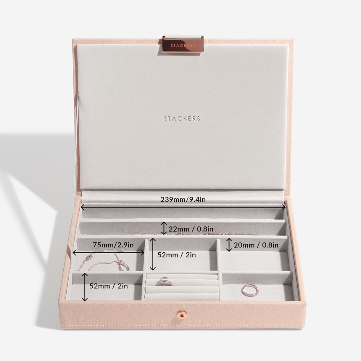 Класическа кутия за бижута с капак на английската компания Stackers. Предназначенa е за сигурно съхранение на вашите обеци, пръстени, колиета, гривни и други фини бижута. Капакът е обезопасен със секретно копче, така че е идеален дори когато пътувате. Кутията е изработена от еко кожа и памук. Може да се комбинира с останалите кутии без капак.