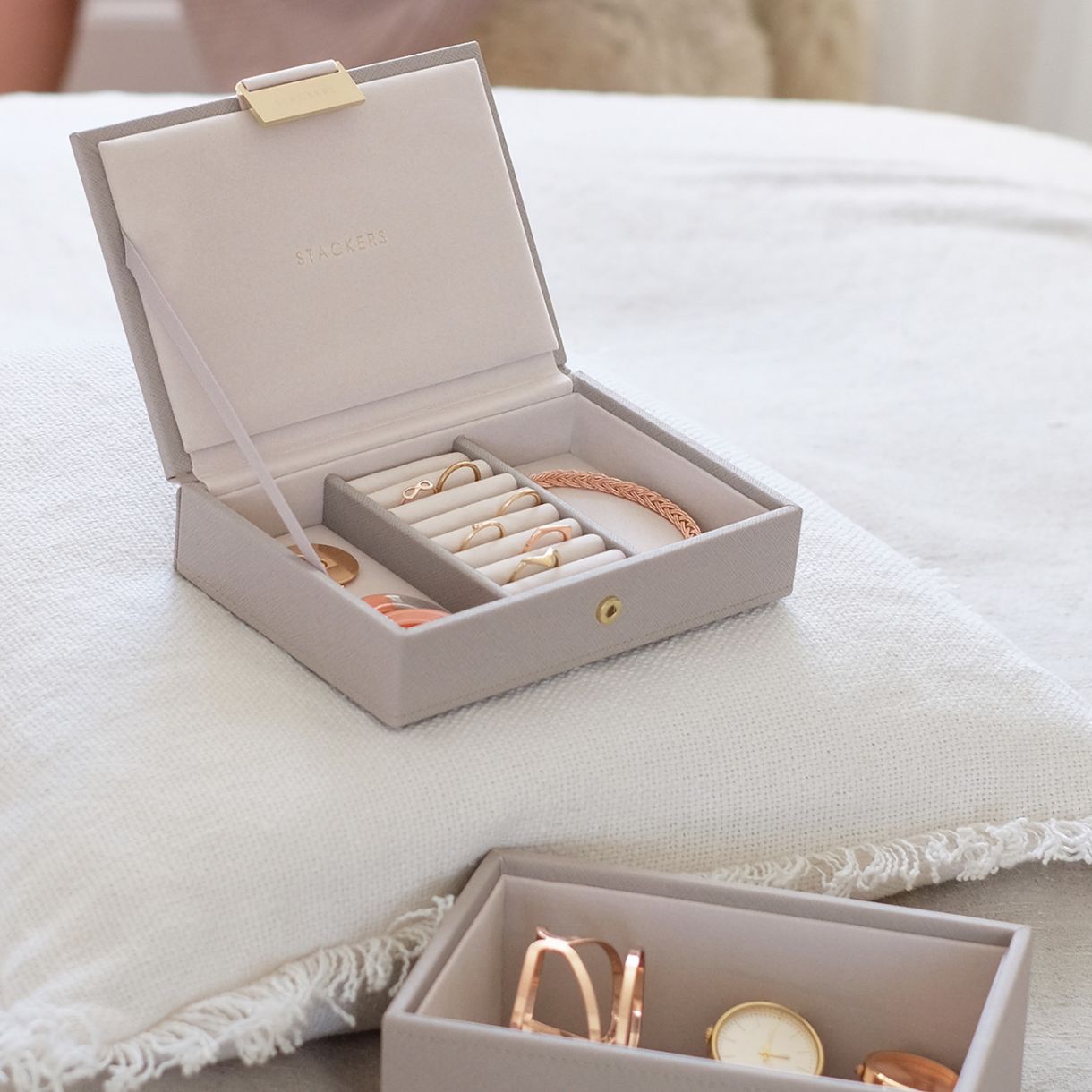 Тези мини кутии за бижута са идеалният размер за вашите ежедневни бижута или за тези, които са в началото на своята колекция от бижута. Заслужаващ дом за вашите любими бижута. Горната кутия е с капак. В нея има многофункционално място за съхранение на вашите пръстени, обеци и колиета, а долната дълбока кутия е идеална за часовник, обемисти гривни или всички онези сантиментални бижута, които всички обичаме да държим.