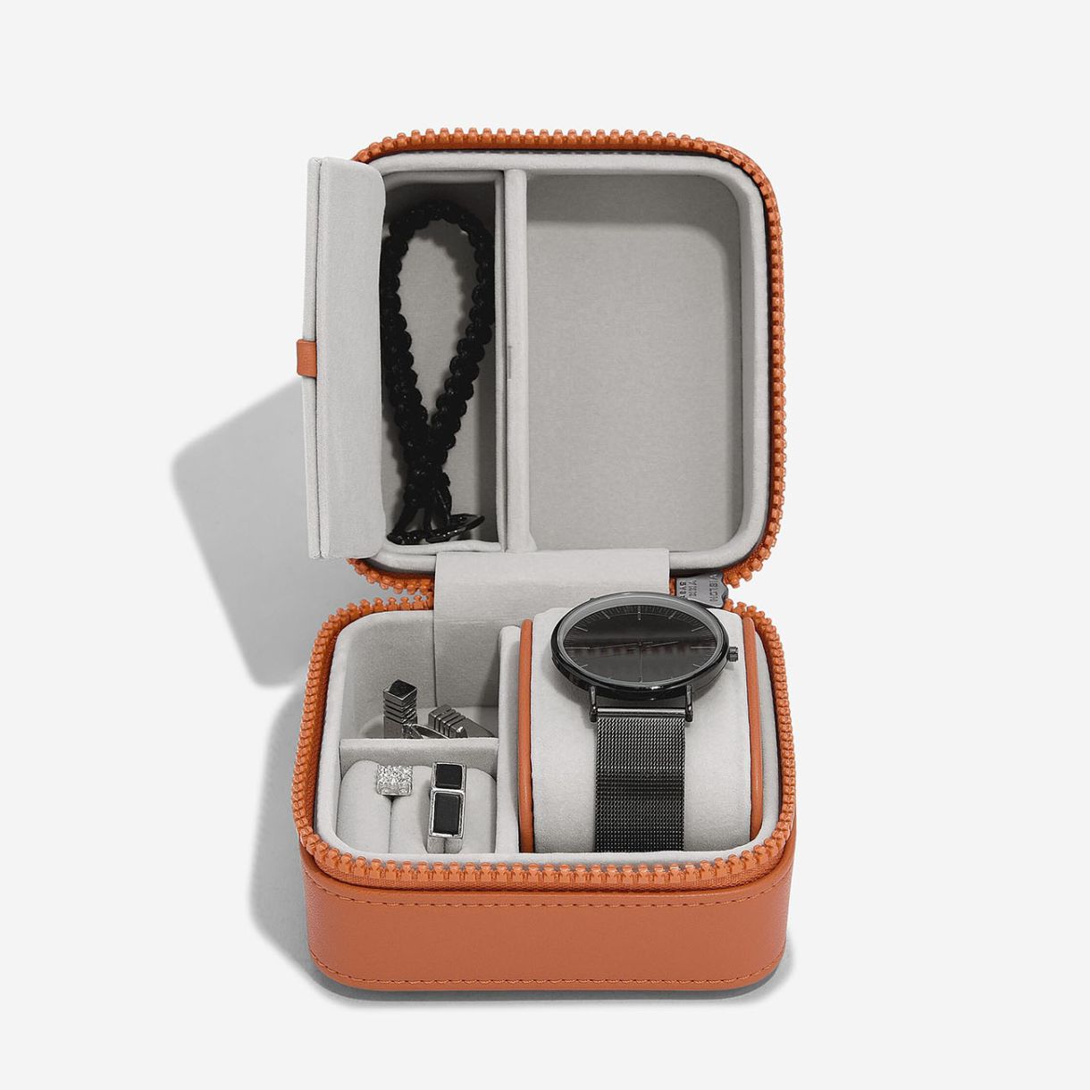 Вътрешността включва подплатена ролка за часовник или гривни, ролка за пръстени и обеци и отделни секции за допълнителни бижута и дрънкулки. Подплатена с меко кадифе, за да се съхраняват бижутата безопасно.