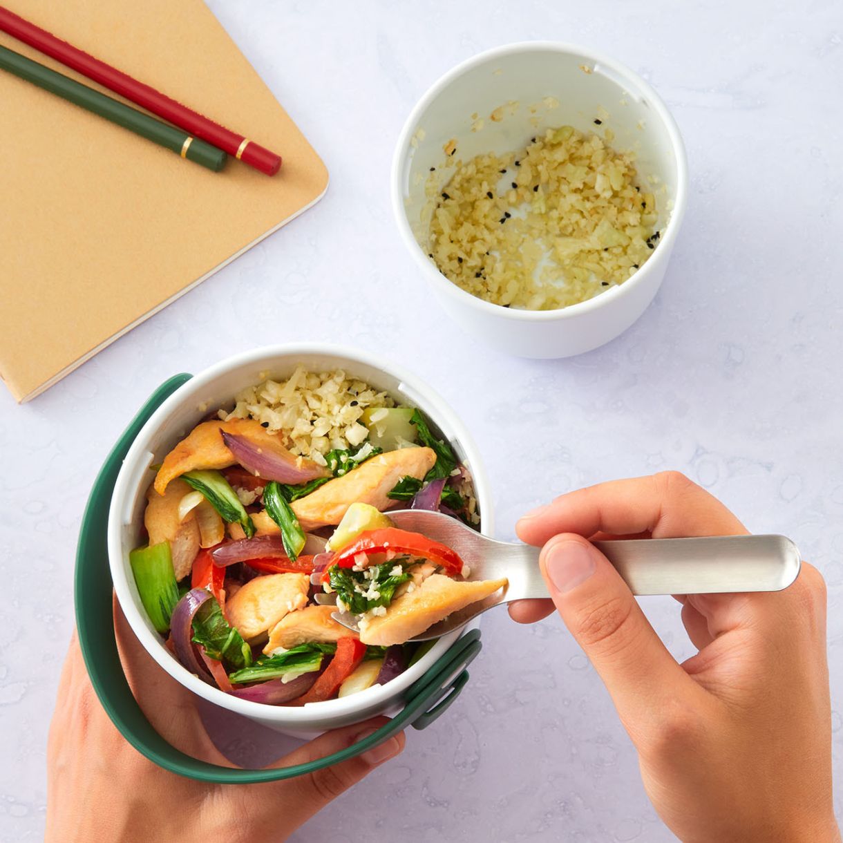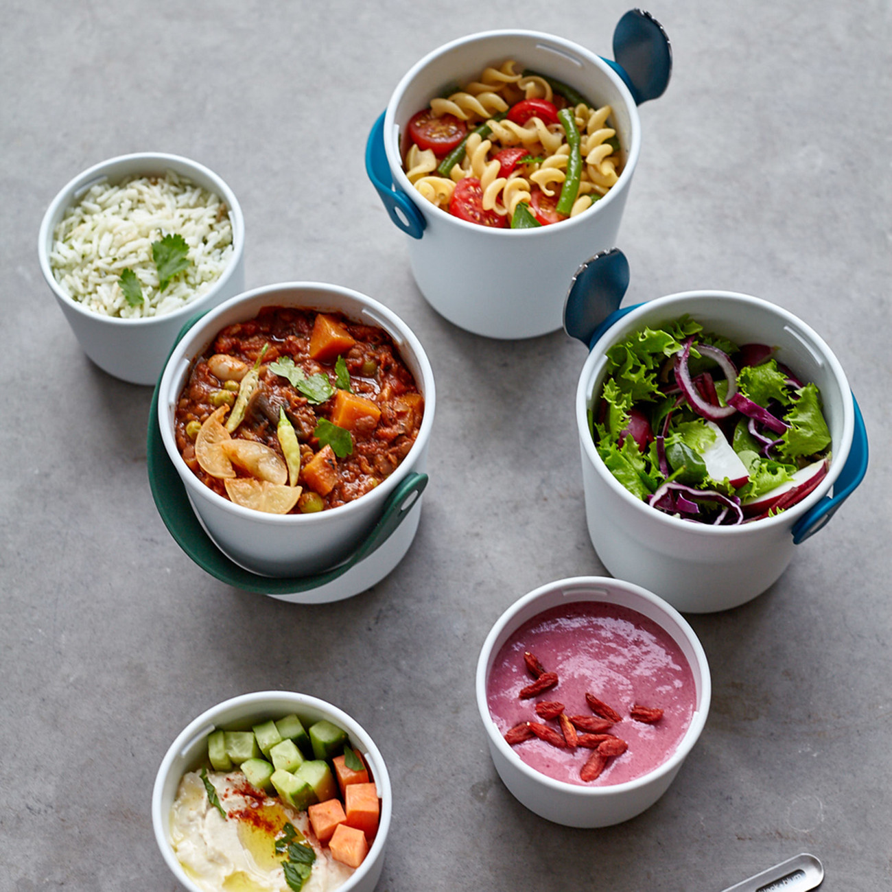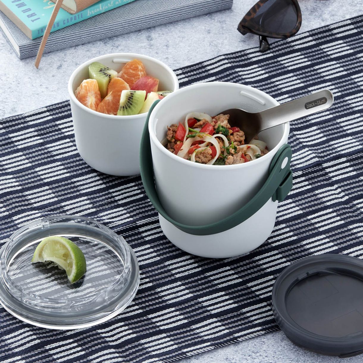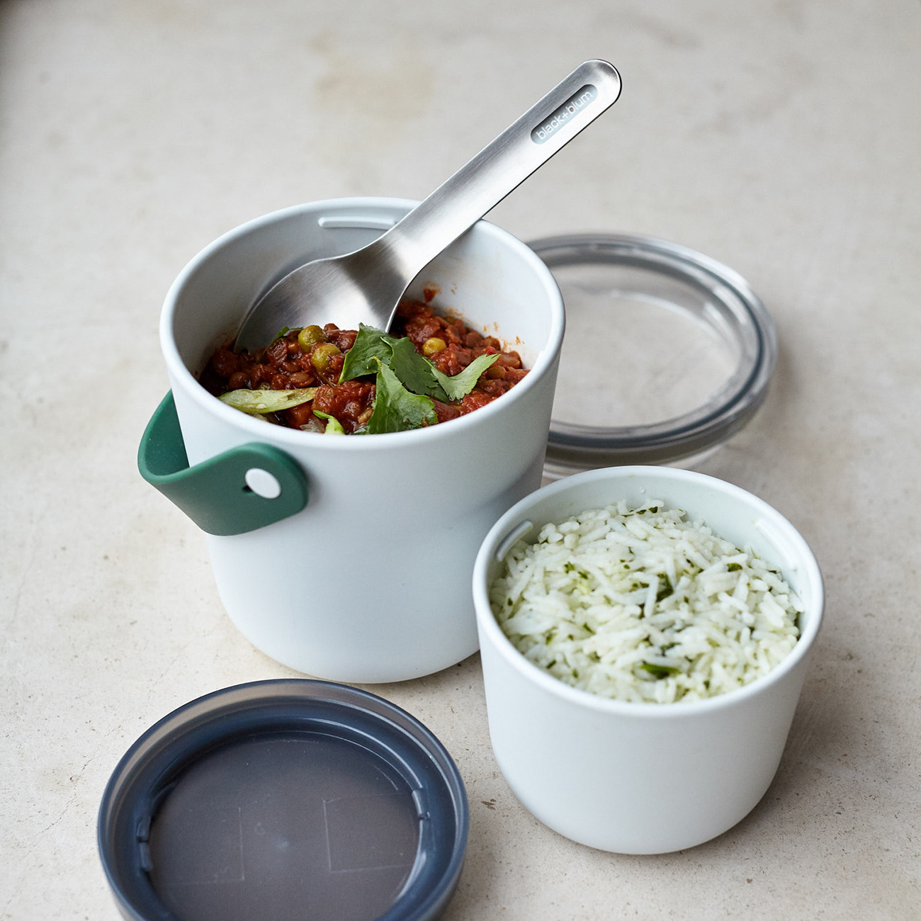 Два отделни съда, които улесняват да носите закуската или обяда си в движение. Включва прибор за хранене от неръждаема стомана (лъжица + вилица) и дръжка за носене. Кутията е изработена е от английската компания Black+Blum. Подходяща е за ползване в микровълнова печка, без капака. Както и в съдомиялна и фризер.