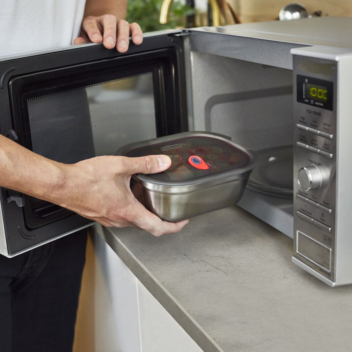 Да, правилно прочетохте, тези стоманени кутии са безопасни за микровълнова печка. Знаем, че всички сме били учени, че металът не може да се постави в микровълновата, но това е само отчасти вярно. Определено има някои метали, които не трябва да се поставят в микровълнова печка, но това не включва висококачествената неръждаема стомана, която използват Black+Blum. Този тип стомана, съчетан с гладката и заоблена форма на стоманените кутии, означава, че те няма да предизвикат искри и са безопасни за използване в микровълнова.