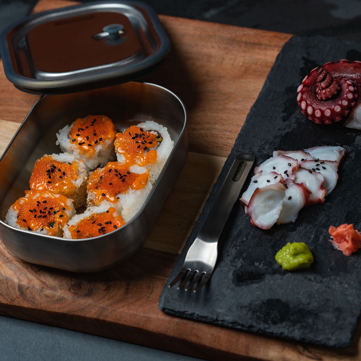 Първата кутия за обяд от неръждаема стомана на английската компания Black+Blum. Това е 3 в 1 мултифункционална кутия за обяд, която ви позволява да носите обяда си, да готвите ястия във фурната и дори да съхранявате предварително приготвени ястия във фризер.