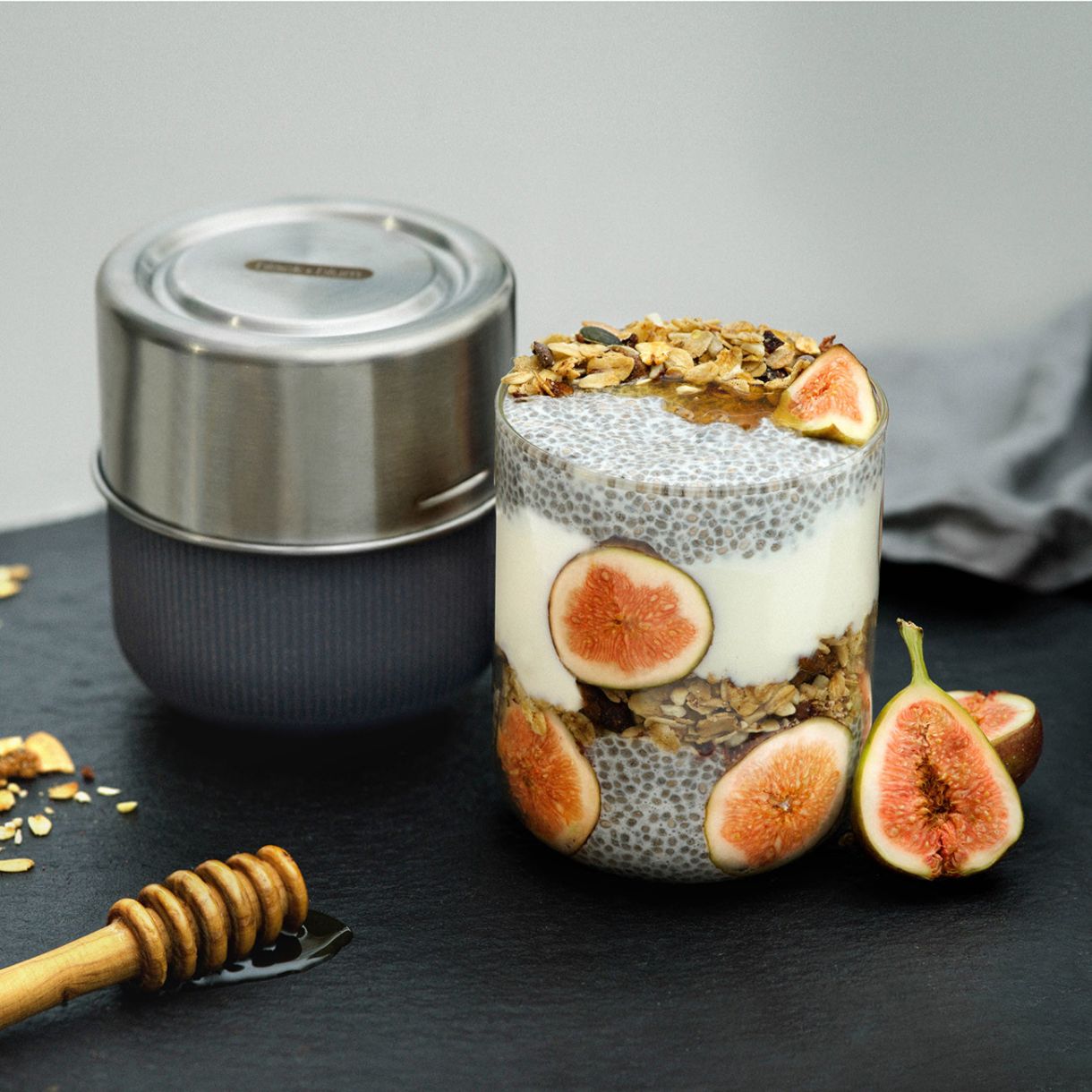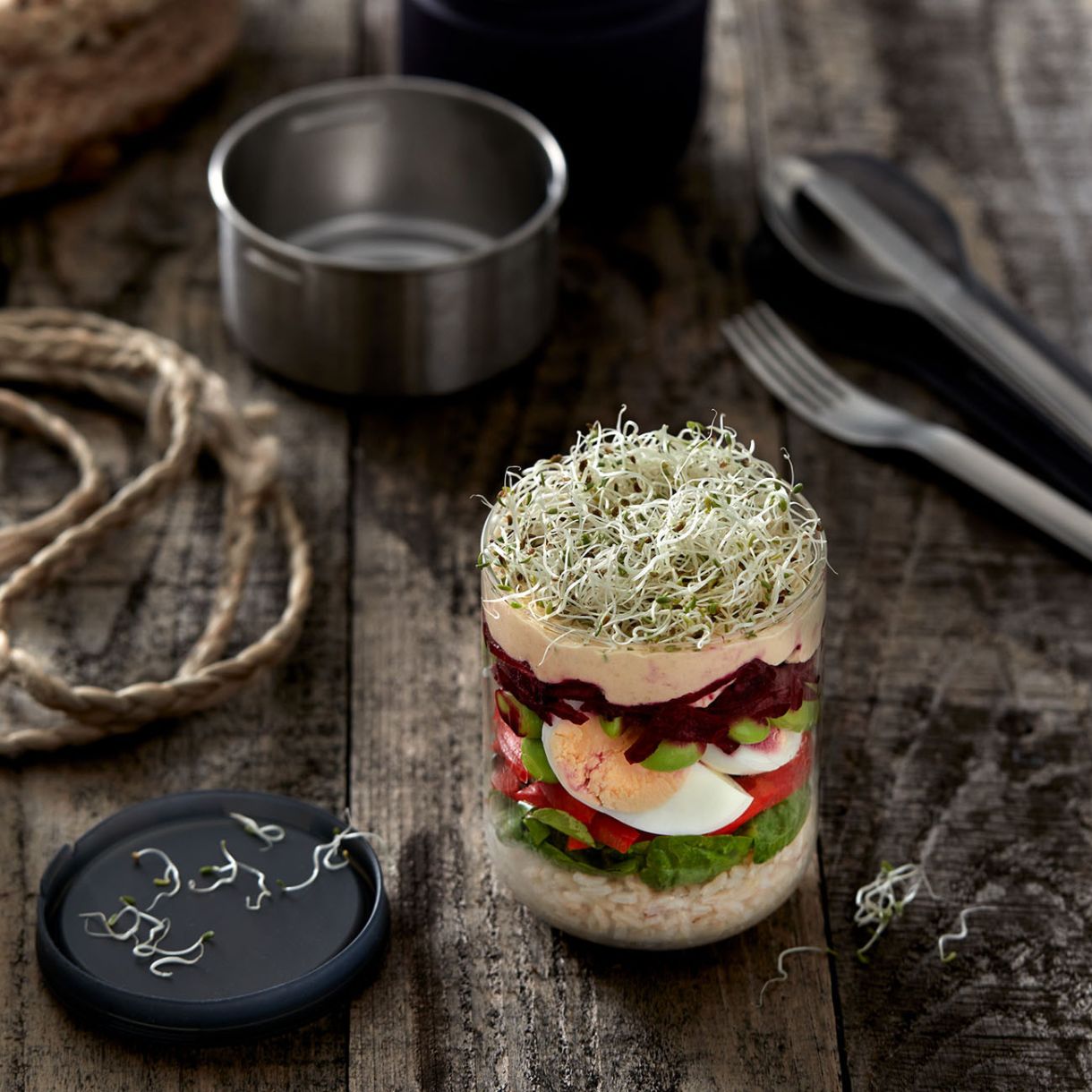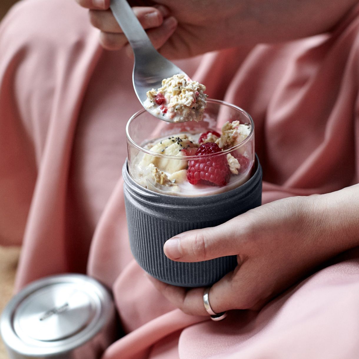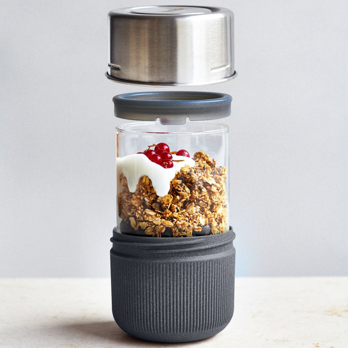 Възползвайки се от лекото тегло и здравината на боросиликатното стъкло, успяхме да създадем по-добро решение за стъклена кутия за храна. Дизайнът е модерен, но има почти утилитарен ретро вид. Използването на неръждаема стомана и полимерна основа от дървесни влакна за защита на стъклото е прекрасна комбинация от материали. Крайният дизайн е иновативен и уникален за пазара. Той предлага издръжливо, функционално решение, което ще остарява добре и е идеално за носене на вашата храна, както и за хранене от самата кутия.