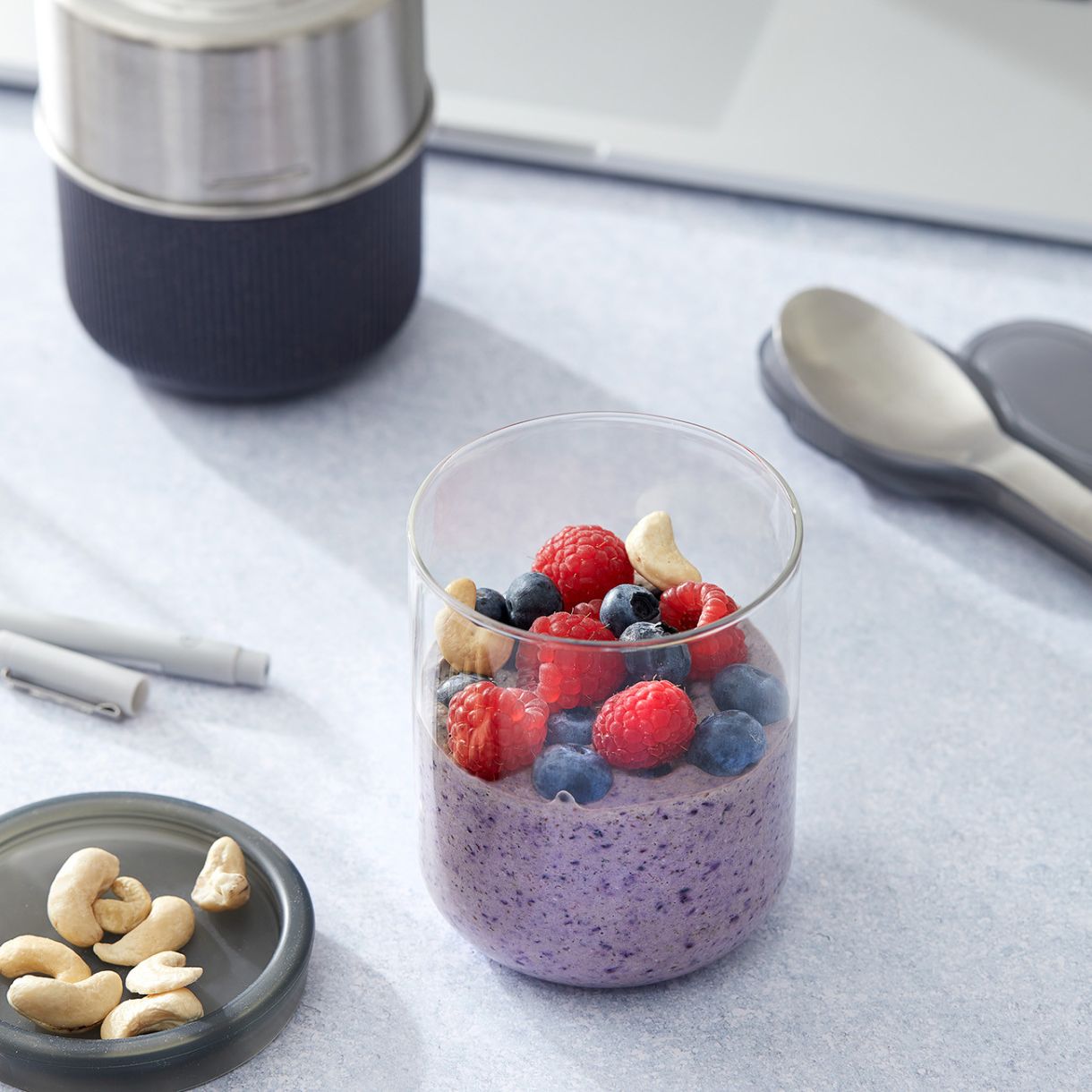 Кутия от боросиликатно стъкло със защитна и изолираща основа от дървесни влакна, и капак от неръждаема стомана. Изработена е от английската компания Black+Blum. Подходяща е за ползване в микровълнова печка, без капака, включително основата от дървесни влакна за лесно боравене, когато е гореща. Както и в съдомиялна и фризер.