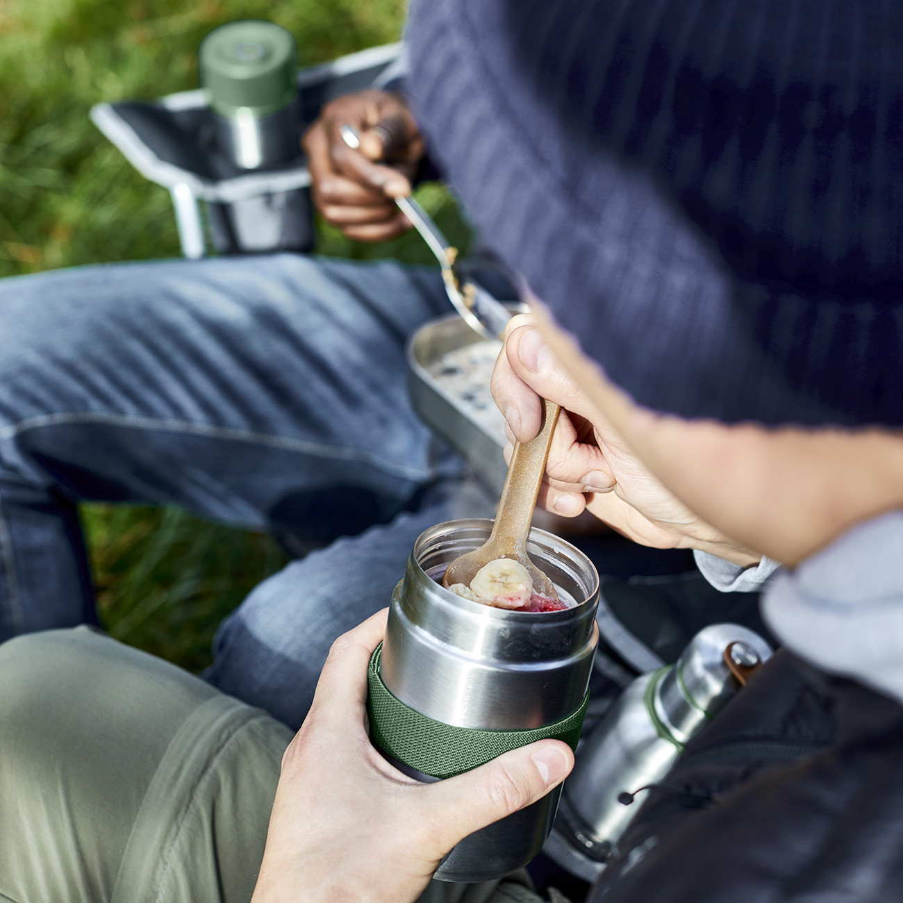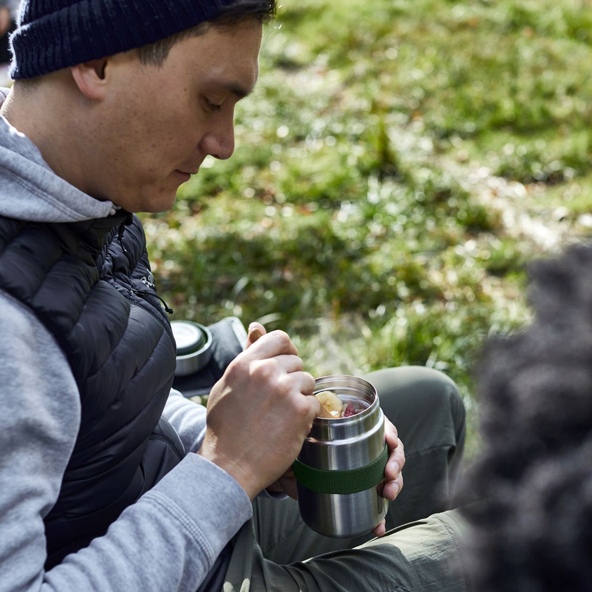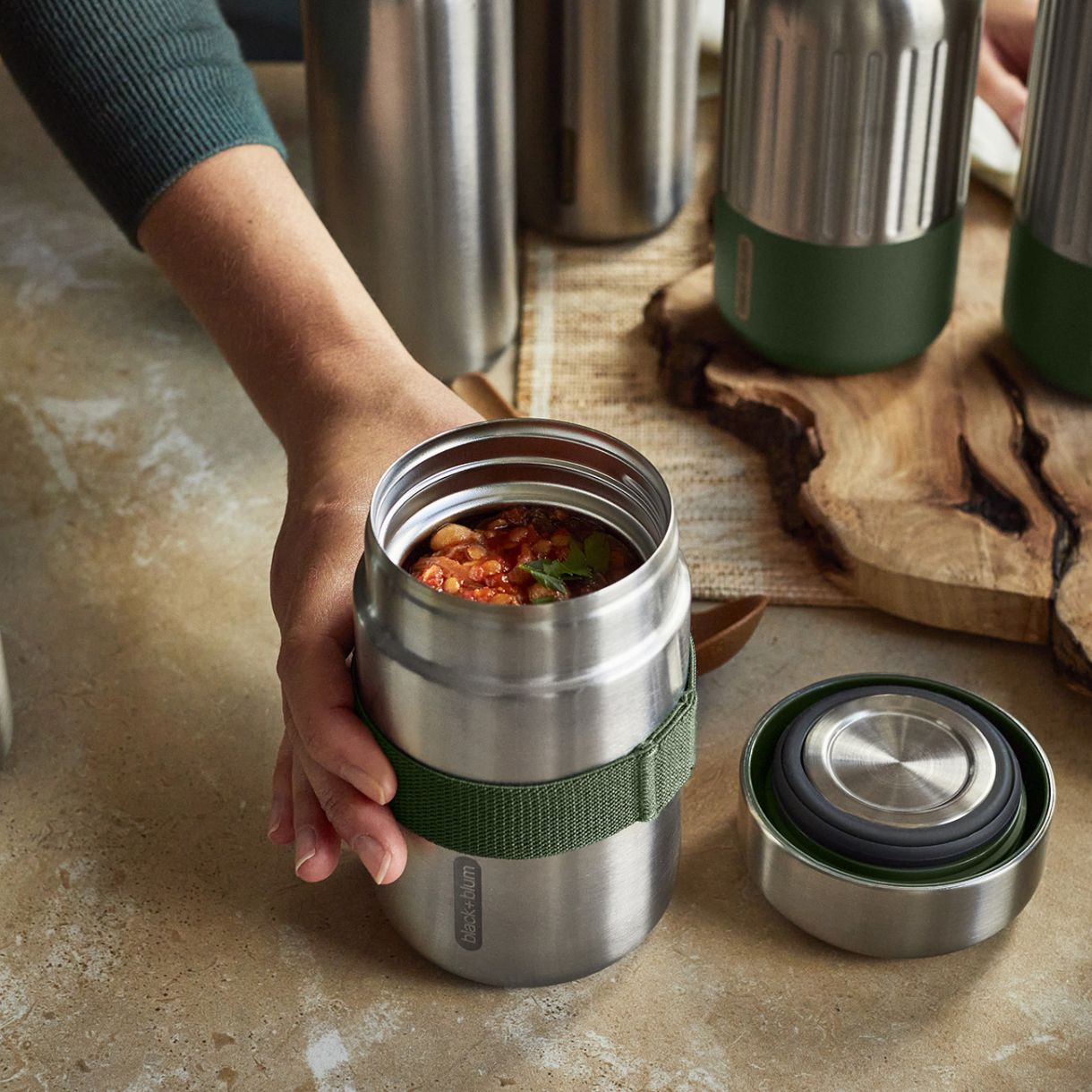 Нова и подобрена версия на двустенната кутия за храна на Black+Blum. Тя е 100% устойчива на течове и ще поддържа храната ви гореща в продължение на 6 часа или студена в продължение на 8 часа. Включена е лъжица от естествени дървесни влакна и еластична каишка от найлон с възможност за пране в пералня.  Изработена е от висококачествена неръждаема стомана и е опакована в подаръчна кутия.
