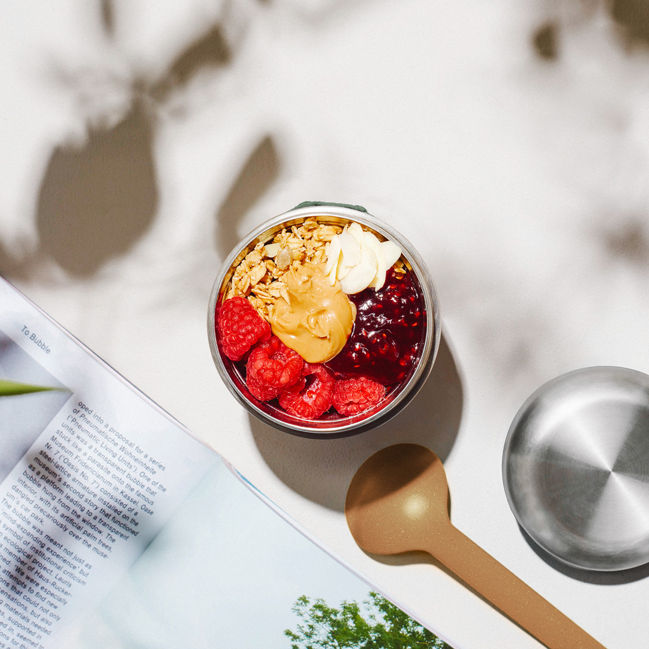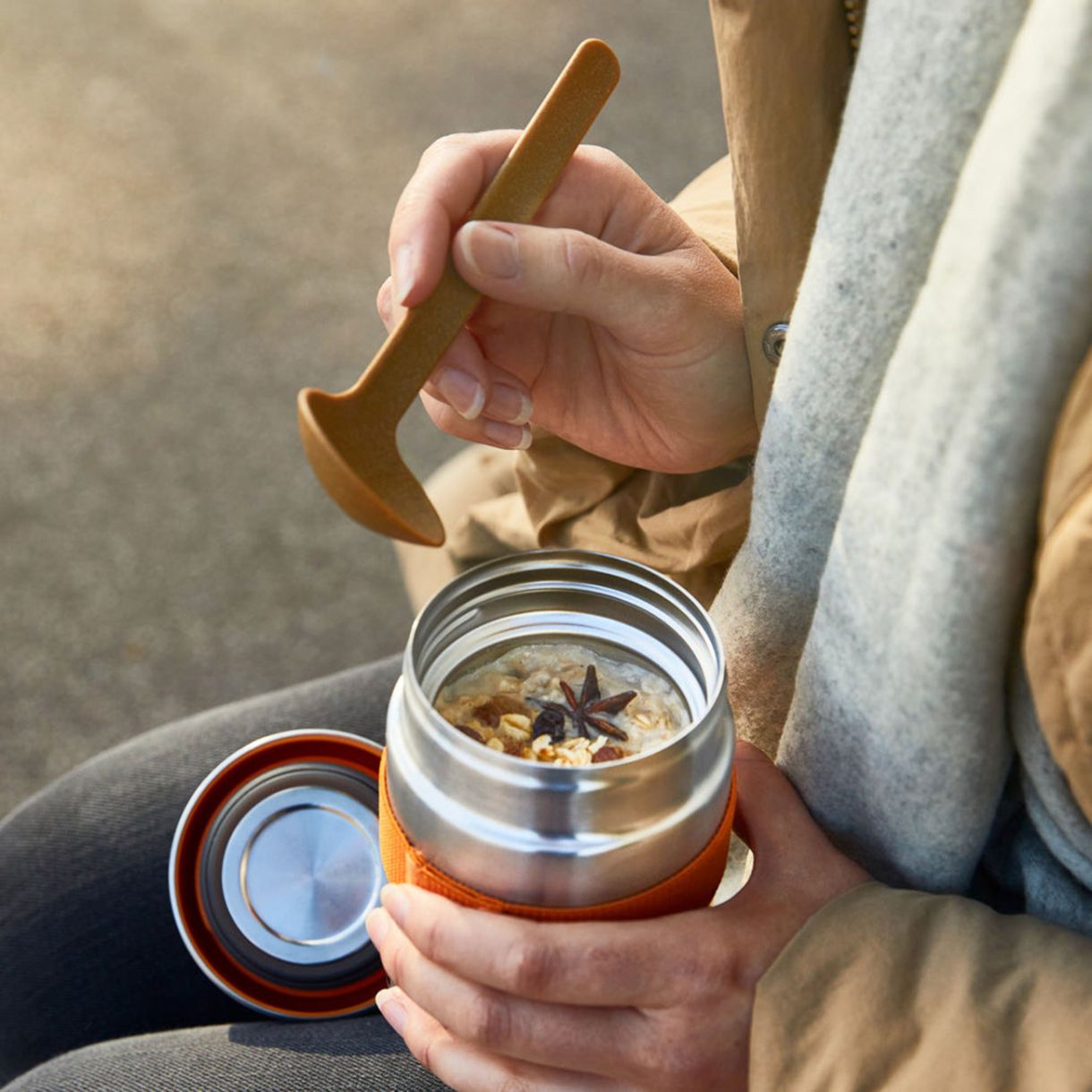Обемът, който побира тази кутия е подходящ както за възрастни, така и за деца. Матираната неръждаема стомана е допълнена от текстилна лента, която спретнато държи лъжицата от естествени дървесни влакна сигурно към кутията. Формата на лъжицата е вдъхновена от японските черпаци за супа рамен. Дългата дръжка ви позволява да достигнете дъното на кутията с лекота, осигурявайки по-добро изживяване при хранене. Обичаме този дизайн, защото е семпъл, практичен и вечен по отношение на форма и функция.
