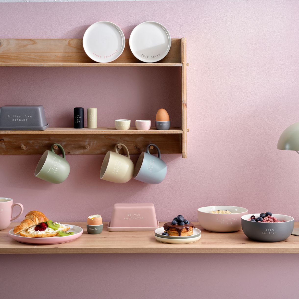 Hey! е топло посрещане на масата за закуска. Всяка част от серията предава свое собствено послание чрез пясъкоструйни надписи и различен цвят. Независимо дали е специален акцент за масата за закуска и кухнята, или като очарователен подарък – Hey! впечатлява със своя дизайн и функционалност.