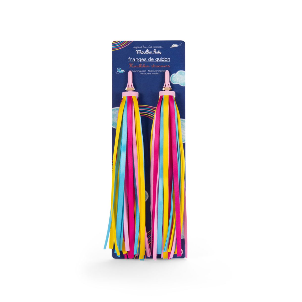 Открийте цветните помпони за кормило от колекцията Aujourd’hui c’est mercredi на Moulin Roty – забавен аксесоар за персонализиране на велосипед или тротинетка. Добавете цвят и настроение с тези многоцветни ресни, които се поставят лесно – просто ги закрепете в краищата на кормилото. И… готово! Потеглете с увереност, с ресни, развяващи се на вятъра – истински стил в движение!