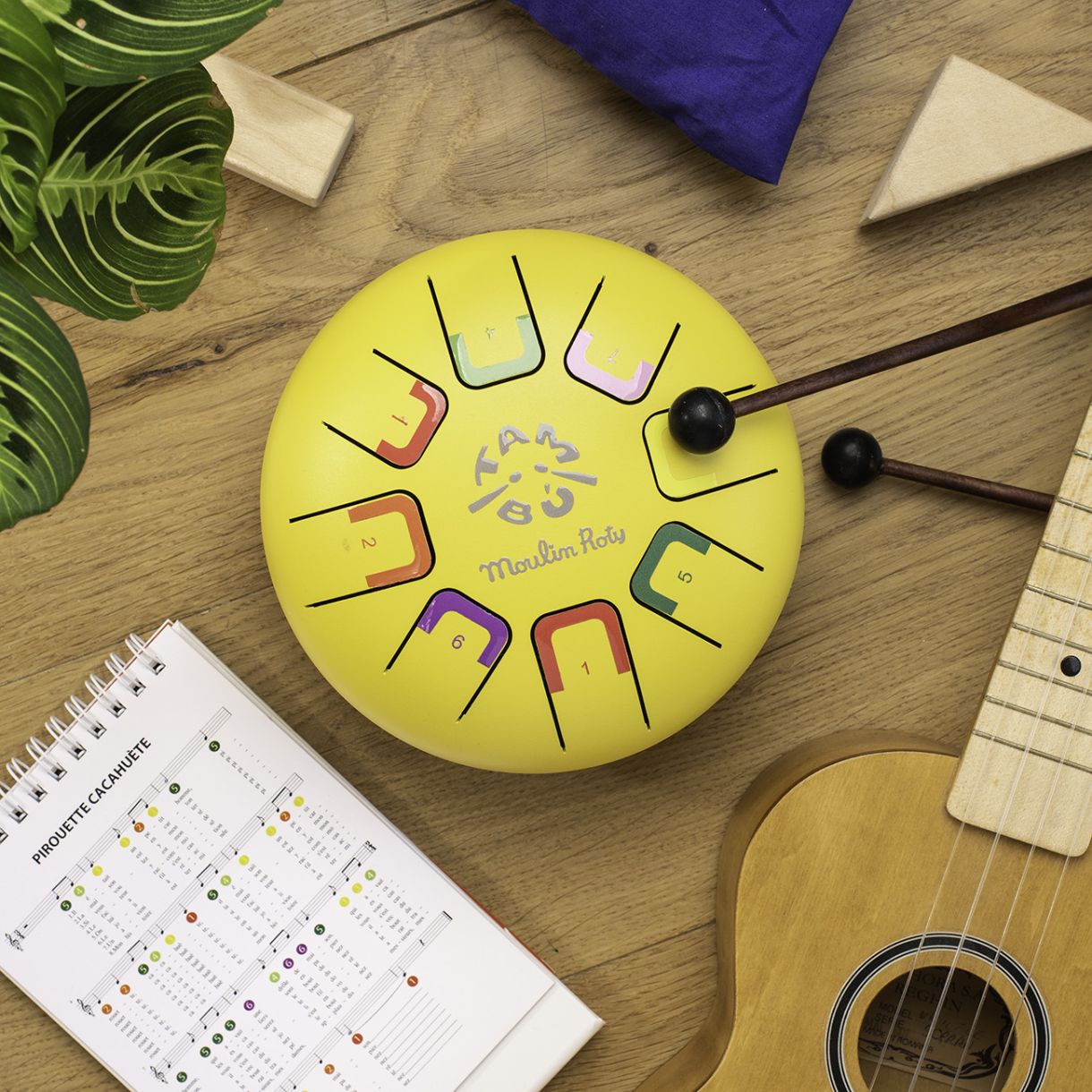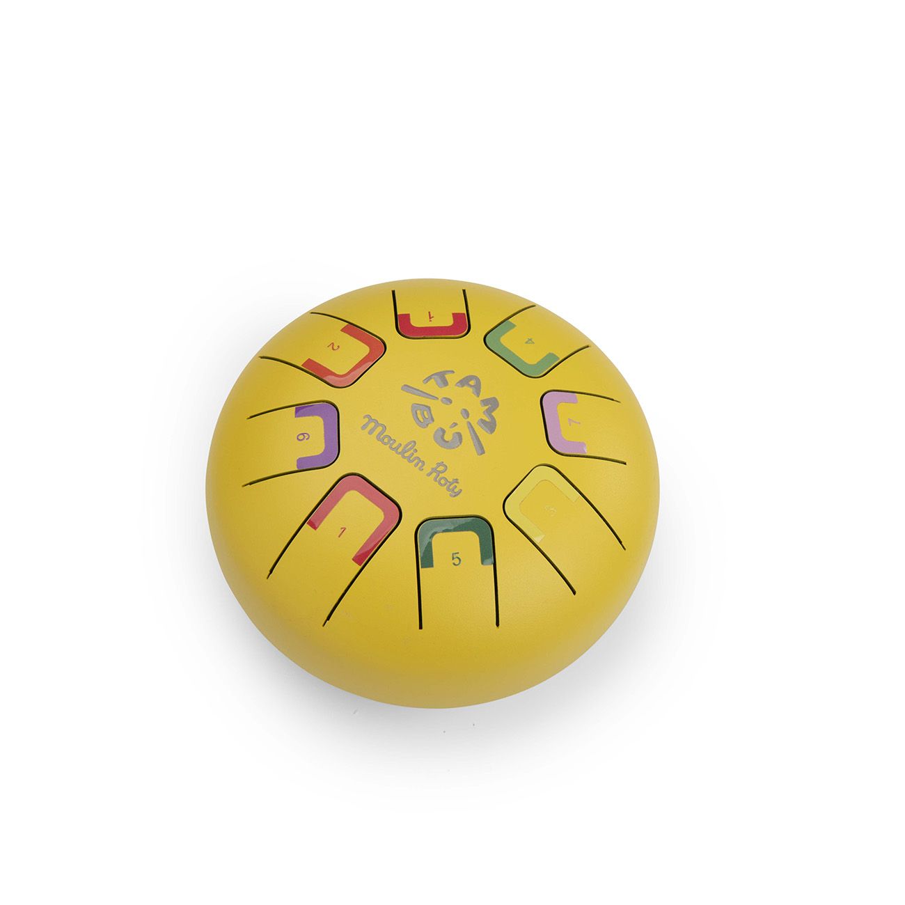 Открийте малкия стоманения барабан за деца от колекцията "Les popipop" на френската фирма Moulin Roty. Благодарение на неговите 8 ноти ще можете да свирите релаксиращи и омагьосващи мелодии. Инструмент за запознаване на децата с ударните инструменти. 11 ноти, обозначени с цвят и номер, за свирене с ръце, пръсти или палки за барабани.