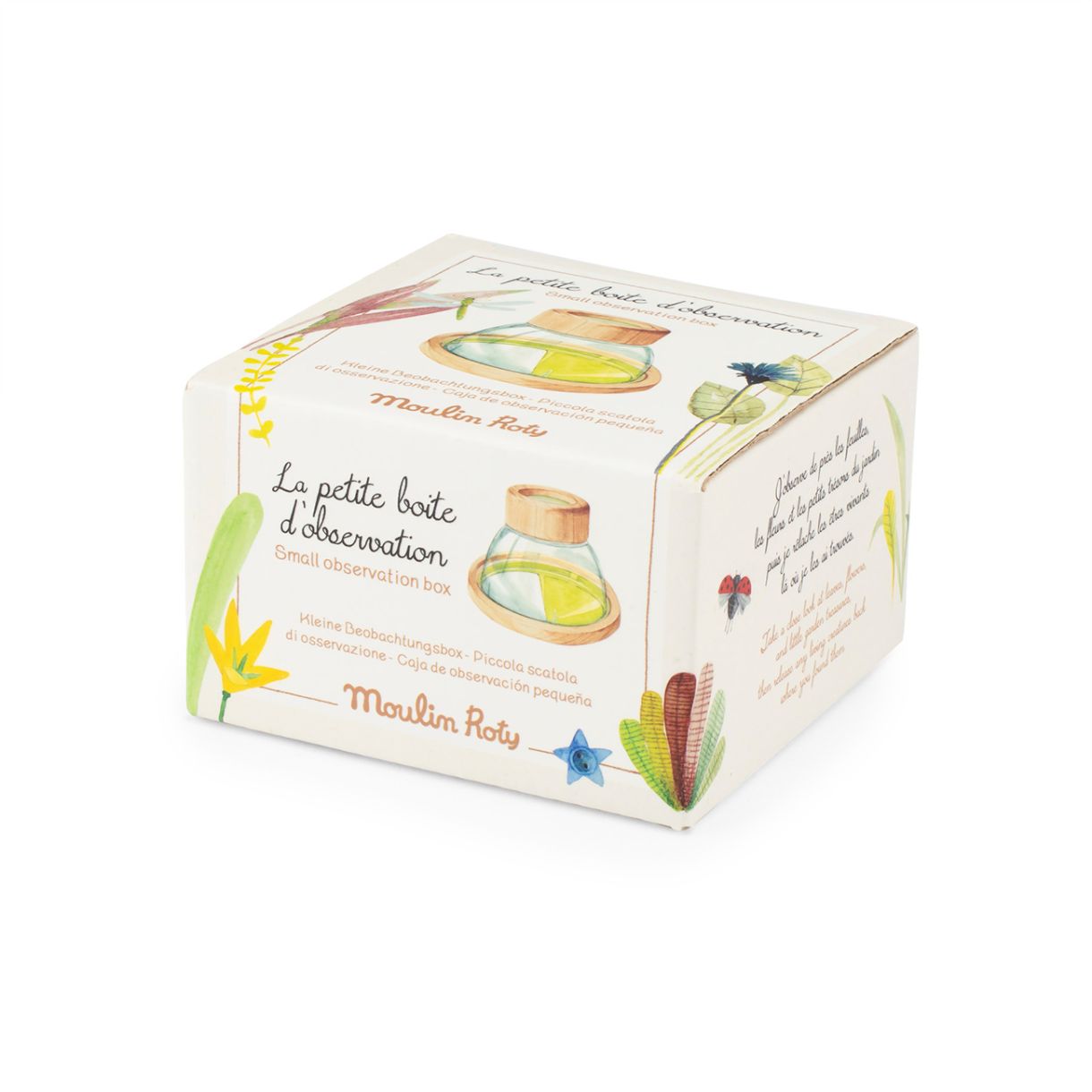 Открийте малката кутия за наблюдение от колекцията в Градината на Moulin Roty – увлекателен инструмент за малки изследователи, които обичат да откриват невидимото с просто око. С увеличение x6, децата могат да разглеждат отблизо листа, цветя и всякакви малки съкровища от природата. Благодарение на плъзгащия се капак, те могат лесно да наблюдават и изучават живите организми в тяхната естествена среда.