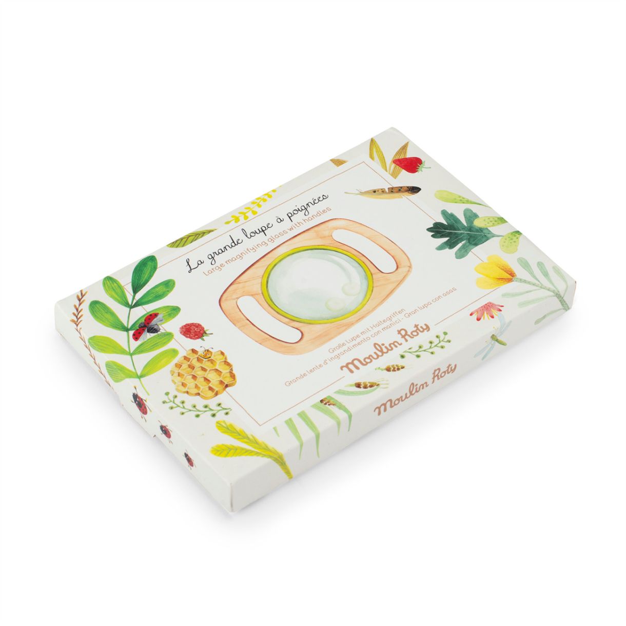 Открийте голямата лупа с дръжки от колекцията в Градината на Moulin Roty – перфектният инструмент за малки изследователи, които искат да разгледат света отблизо. С три степени на увеличение (x2, x3 и x4) децата могат да наблюдават най-фините детайли на растения, насекоми и малки съкровища от природата. Благодарение на двете удобни дръжки, лупата осигурява стабилен захват и комфорт при използване.
