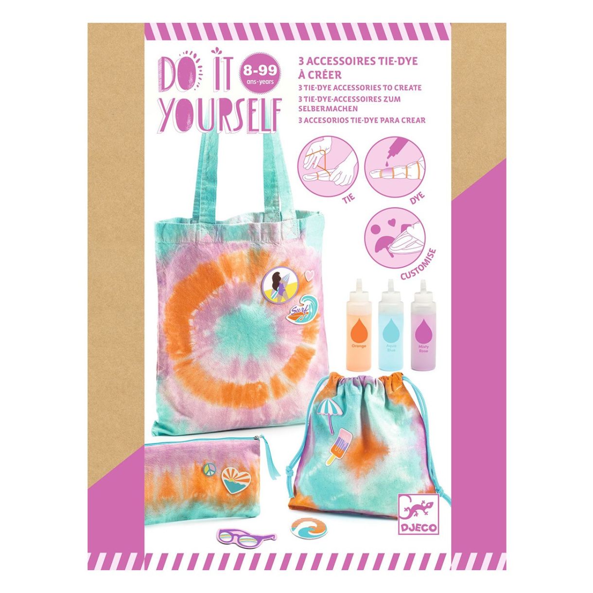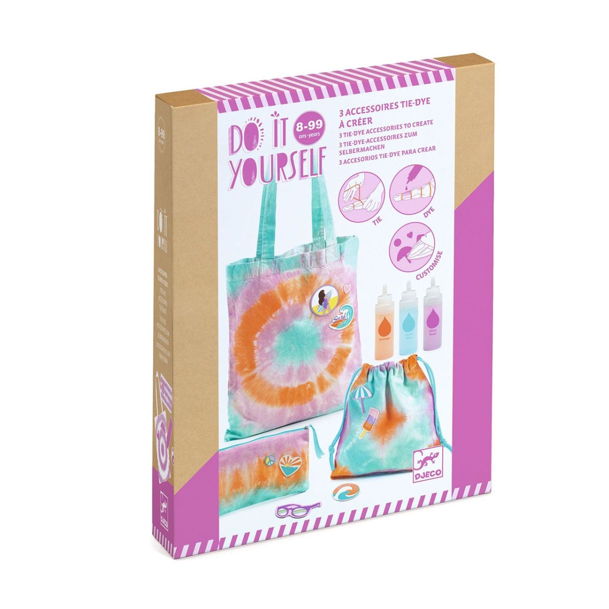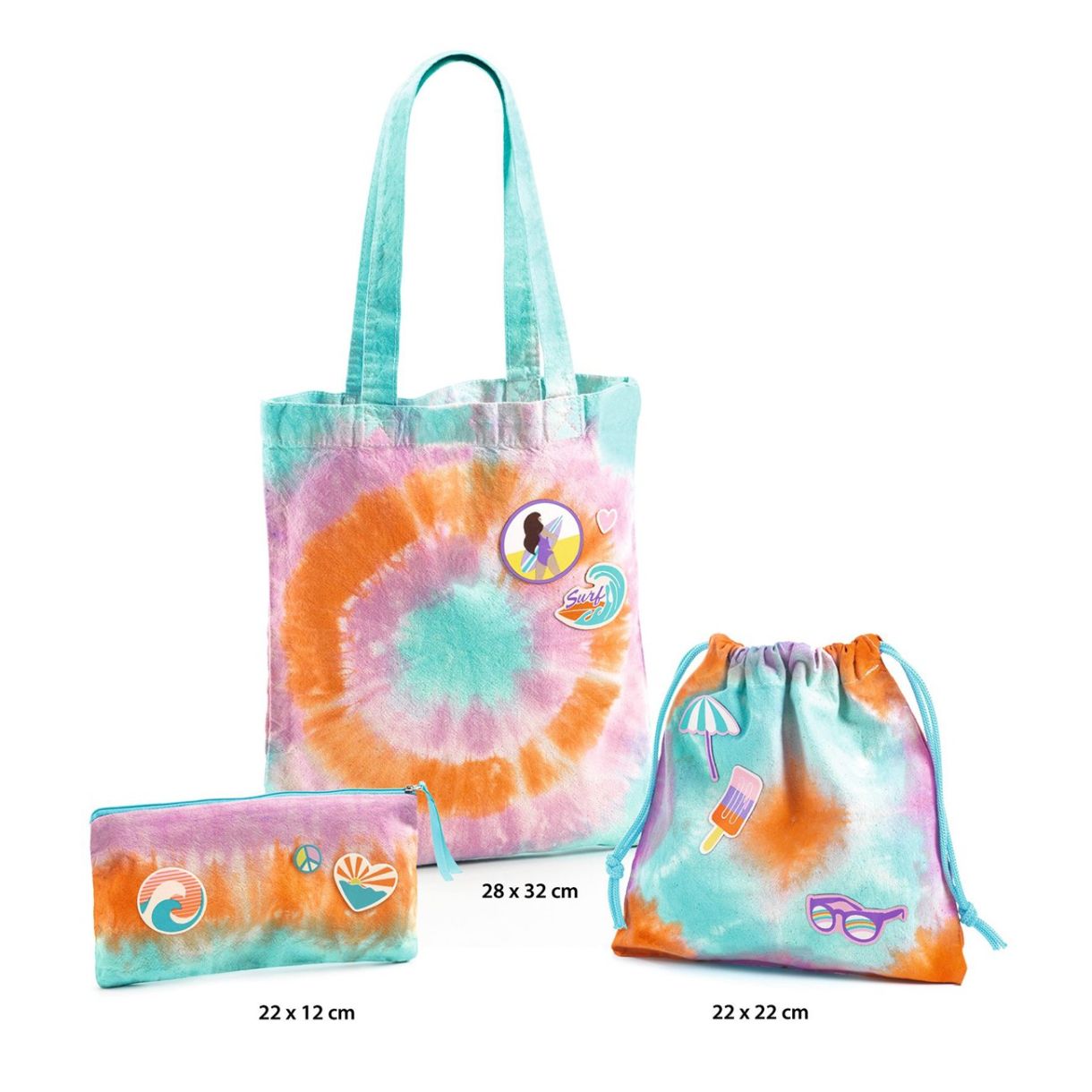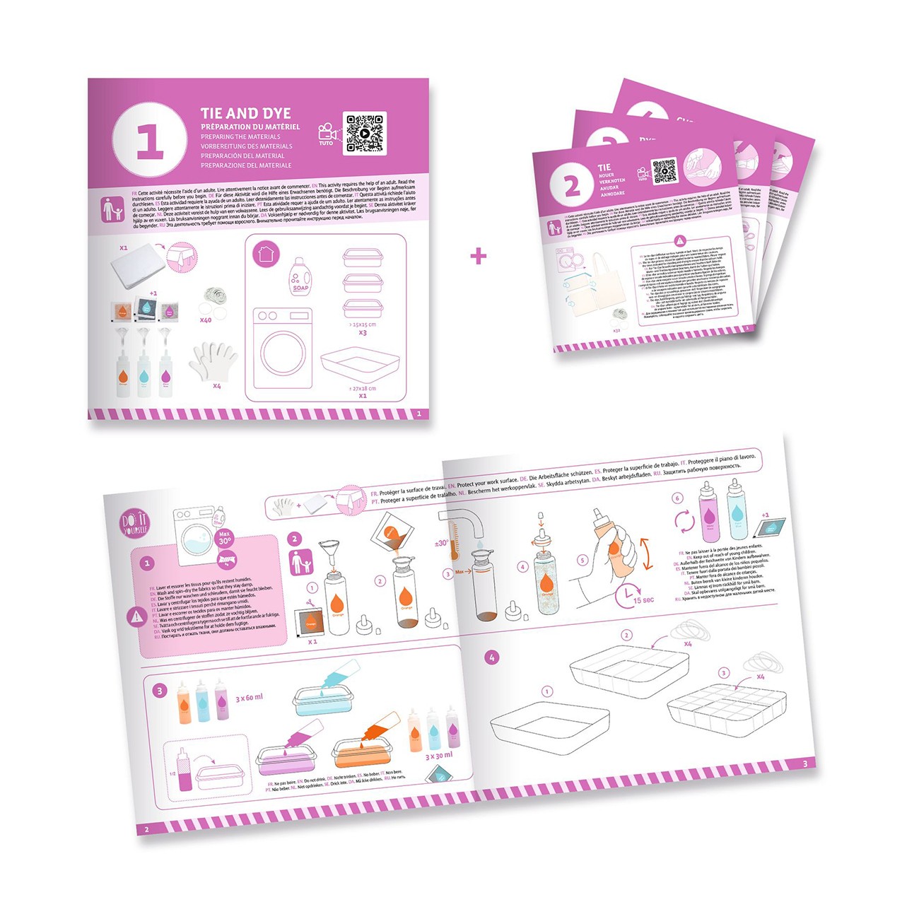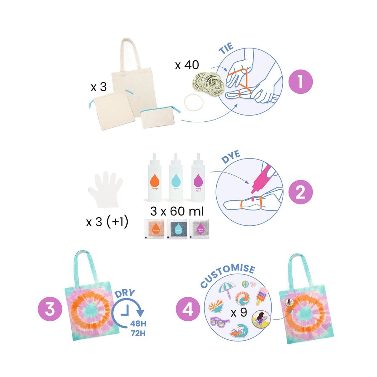Творчески комплект за откриване на тай-дай и неговите уникални нюанси. Създавайте различни модели точно като текстилен дизайнер! Следвайте инструкциите, за да научите как да връзвате аксесоарите от плат и да ги боядисвате с предоставените цветове. Има 3 различни техники за създаване на шарки: кръгли, геометрични и линии. След като изсъхнат, аксесоарите могат да бъдат персонализирани с помощта на предоставените стикери за залепване с ютия. Всяко творение е уникално!