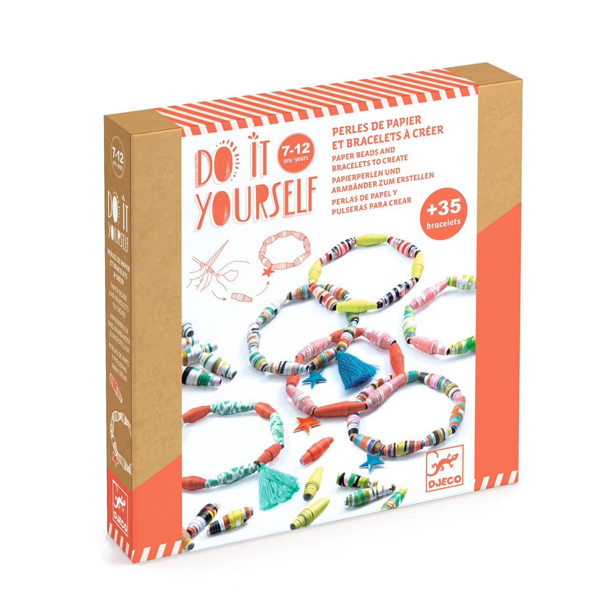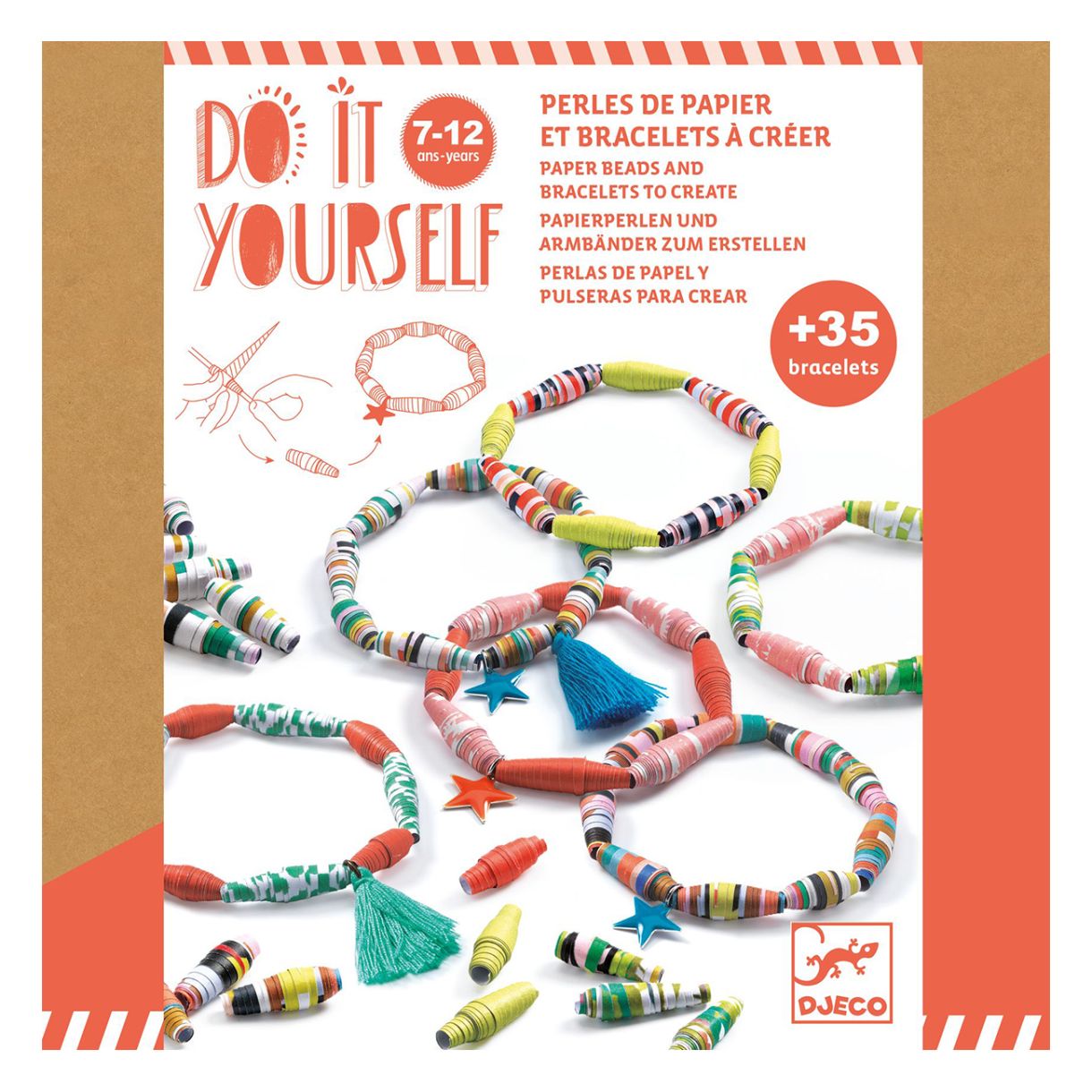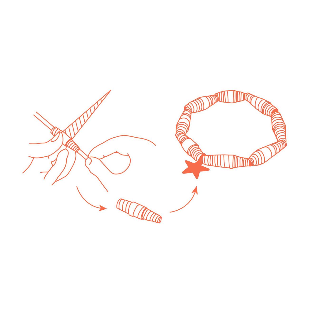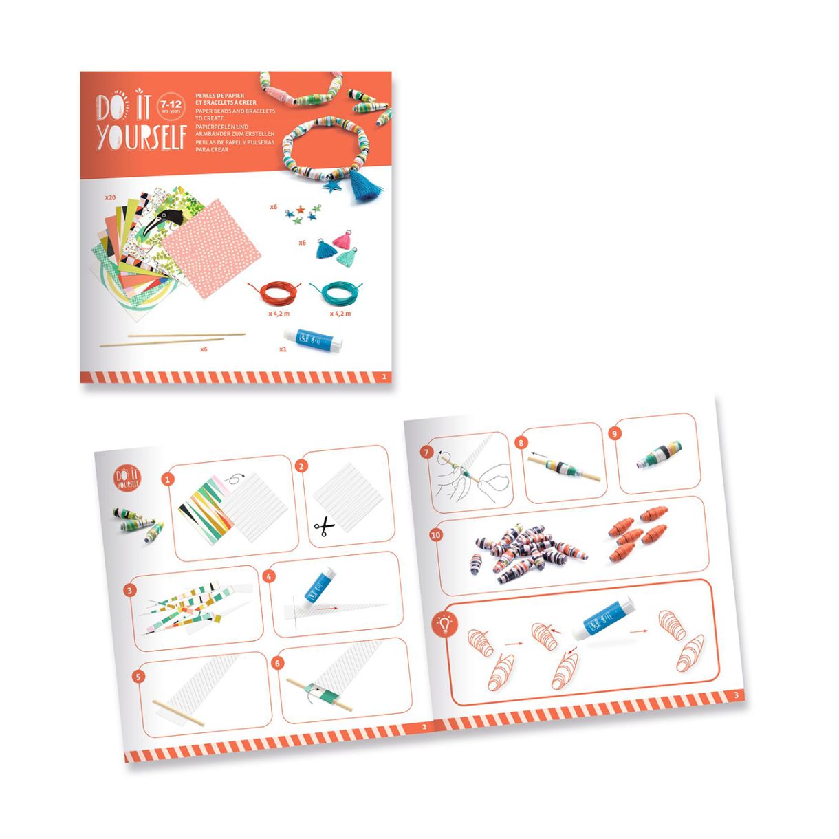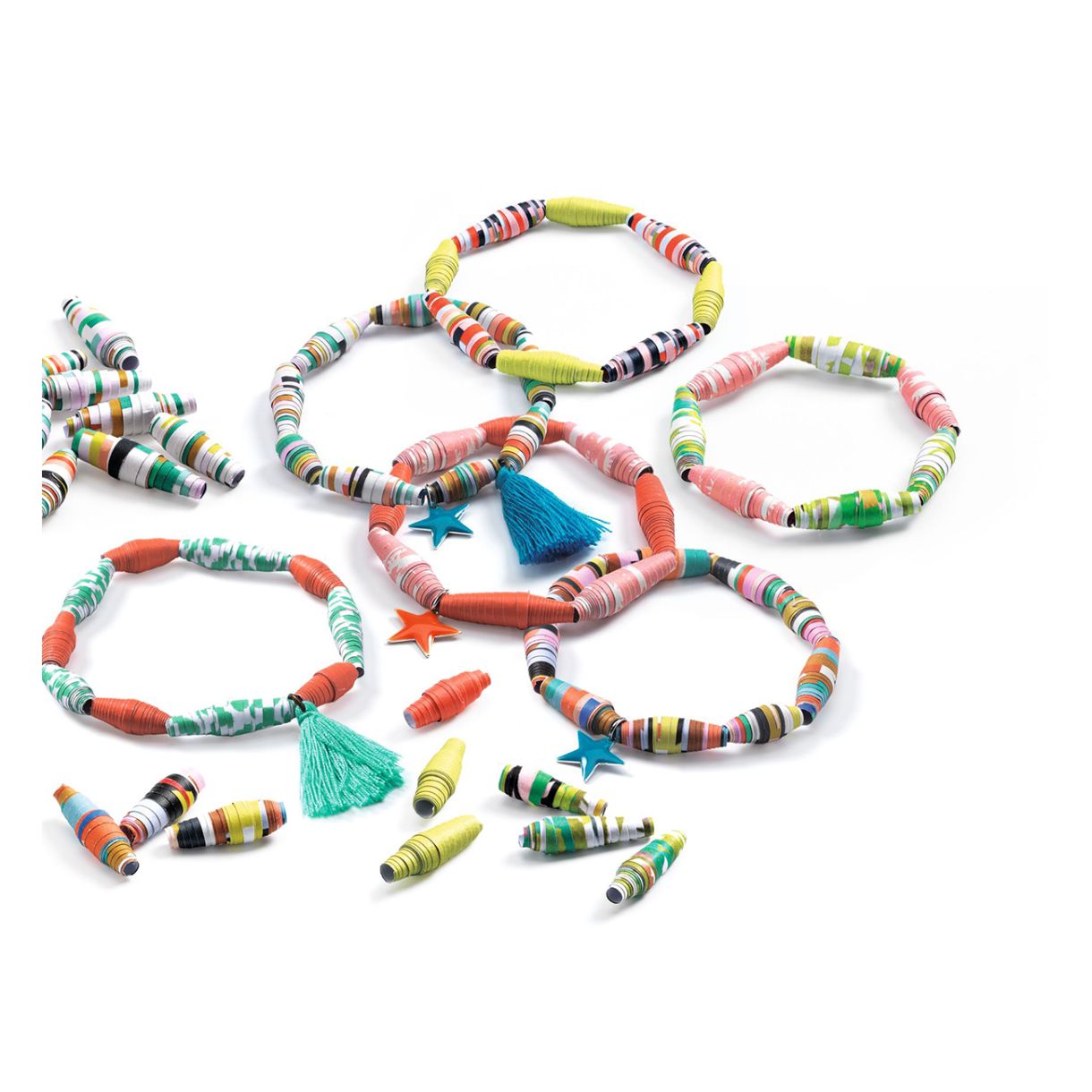 Комплект от серията изкуства и занаяти за създаване на всякакви цветни гривни от ръчно изработени хартиени мъниста. Децата изрязват шарените листове на ленти, които навиват на клечка и залепват. След това мъниста са готови за нанизване на еластичния шнур, за да се създадат красиви бижута! Някои дори могат да бъдат украсени с помпони или цветни звезди.