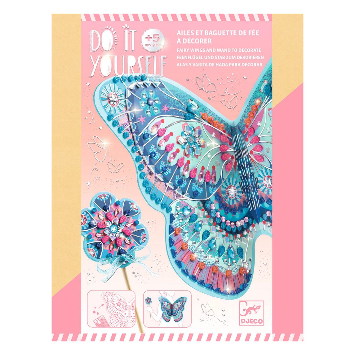 Комплект за изкуства и занаяти, съдържащ пръчка и чифт приказни крила за украса. Детето открива номерата, отпечатани върху аксесоарите, и залепва върху тях блестящите стикери от пяна и стикерите с кристали. След като двата аксесоара са украсени и са блестящи и искрящи, остава само да ги сглоби и да се потопи в мечтателния свят на феите, за да съчини най-красивите истории!