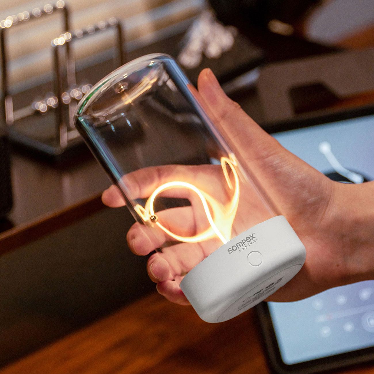 Благодарение на своята степен на защита IP54, осветителното тяло създава привлекателна атмосфера както на закрито, така и на открито. PULSE може удобно да се зарежда чрез USB-C. С помощта на сензора за докосване можете да избирате между три настройки на светлината: 15% яркост (фина околна светлина), 100% яркост и пулсираща светлина. PULSE е идеална като настолна лампа за ресторанти, като модерна декоративна лампа на бюфет или като стилен аксесоар за бюро.