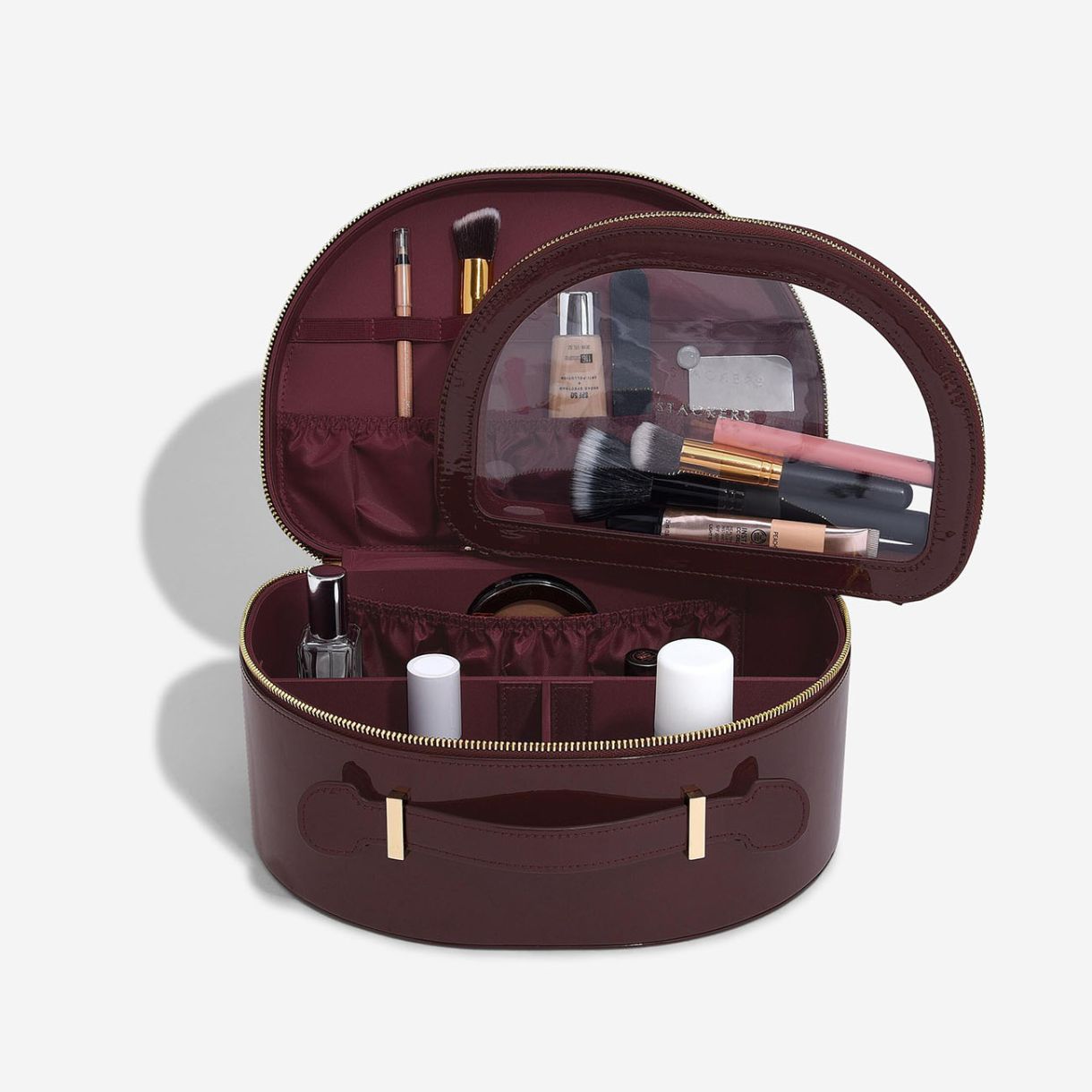 Несесерът включва множество вътрешни джобове и еластични примки за безопасно съхранение на козметични продукти. С подвижен прозрачен калъф, идеален за съхранение на четки за грим, отделно и чисто. Несесерът има вътрешни разделители, които ви помагат да организирате принадлежностите, огледало и подплата, която може да се почиства.