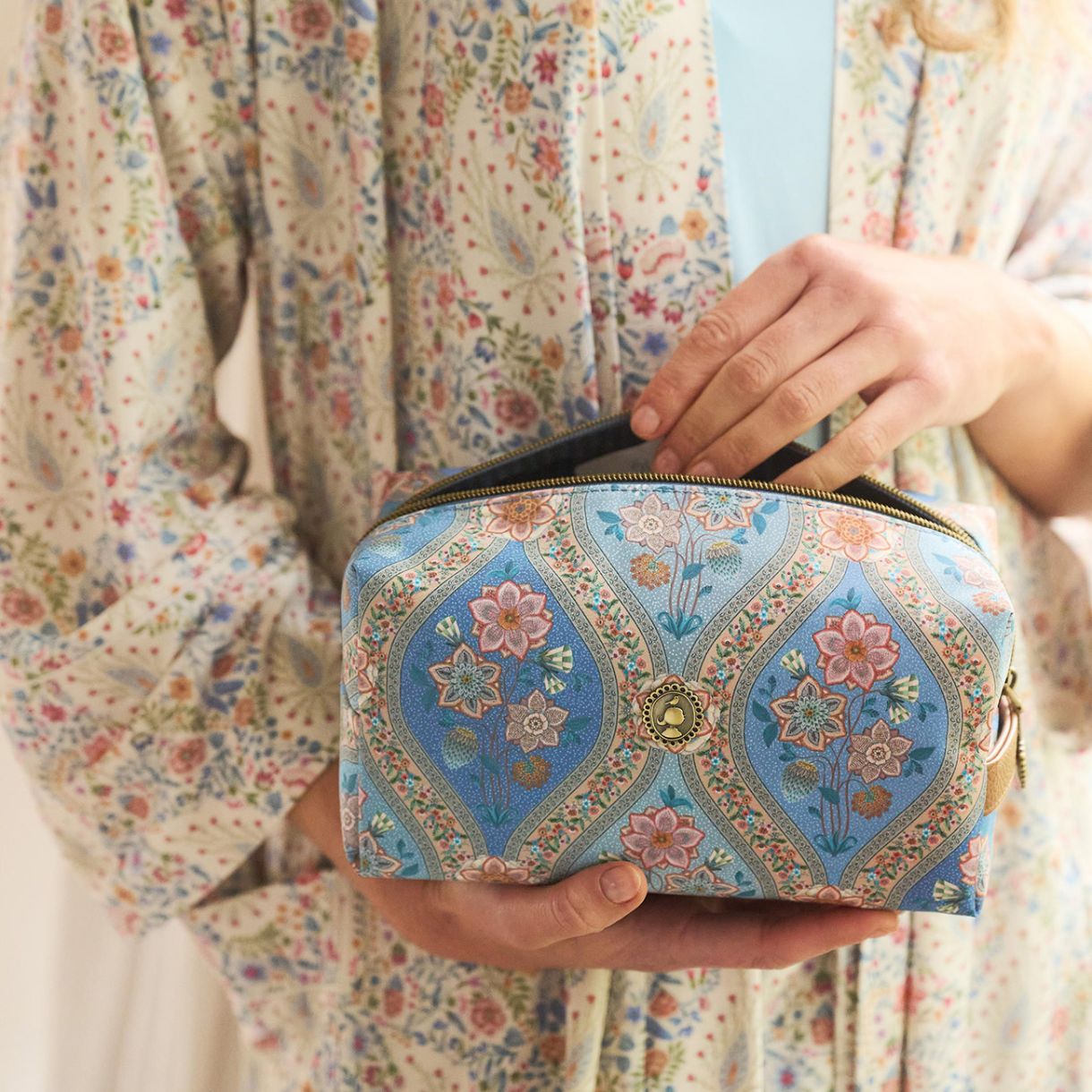 Несесерът Coco на PIP Studio е вашият цветен спътник в козметиката за дома и в движение. Дизайнът напомня на лятна керамика и е украсен с елегантни цветя. Компактният му размер го прави лесен за побиране в чантата ви за уикенда, а трите вътрешни джоба помагат да държите всичките си най-необходими вещи идеално организирани.