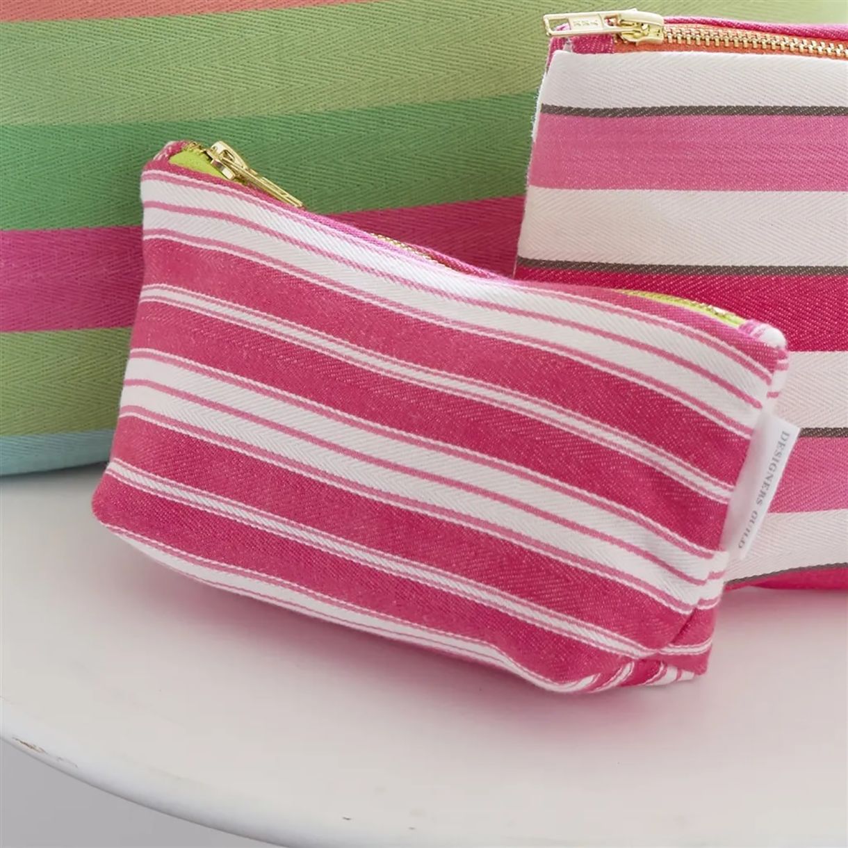 Добавете доза стил към Вашето пътуване с луксозния несесер Burlington Stripe от Designers Guild. Този практичен и същевременно елегантен аксесоар е изработен от здрав памучен плат с модерен десен на широки райета в наситено кобалтово синьо или розово. Вътрешната част е завършена с практична водоустойчива подплата и вътрешен джоб, осигуряващи перфектна организация за Вашата козметика. Здравият метален цип и качествената изработка гарантират дълготрайна употреба. Burlington Stripe е идеалният спътник за всеки, който цени съчетанието между функционалност и изтънчен дизайнерски стил.