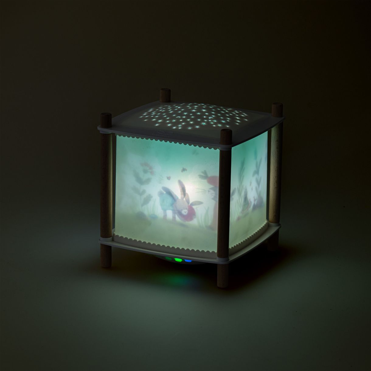 Вълшебна лампа за приспиване на бебето с декор на зайчета в градината. Многофункционална, тя прожектира звезди, възпроизвежда 4 приспивни песни, свързва се дистанционно и дори разпознава плач! Включен USB кабел. Този лампа е оборудвана с иновативна функция за разпознаване на плач, която и позволява да реагира, когато бебето започне да плаче. След това тя автоматично възпроизвежда една от четирите вградени приспивни песнички. В партньорство с Trousselier.
