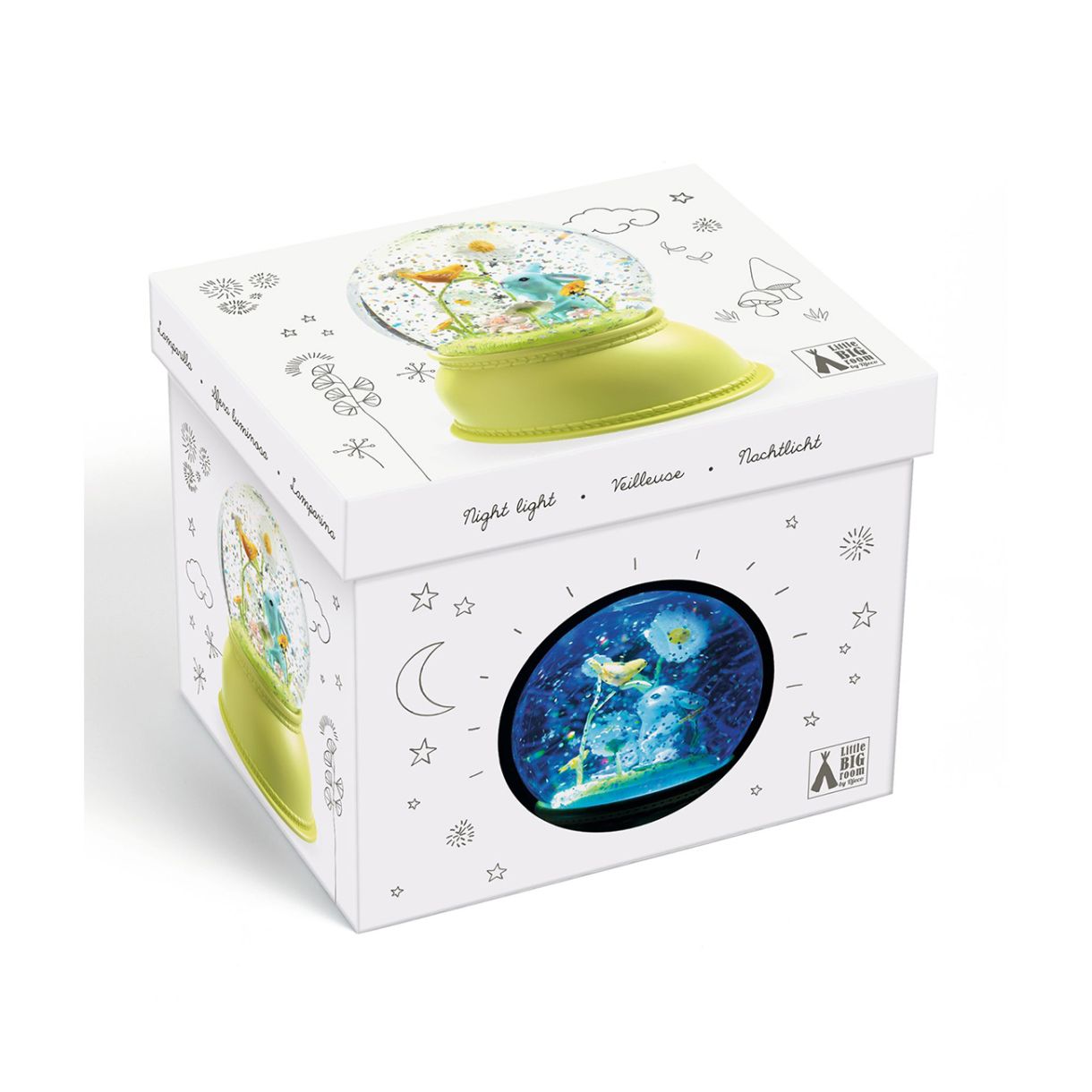 Нощна лампа с блестяща снежна сфера и красив заек. Тази нощна лампа, пълна с брокат, разполага с безшумен механизъм, който завърта брокатите и излъчва мека светлина, променяща цвета си. За успокояващ и спокоен нощен сън. Работи с 3 x LR6 1.5 V - AA батерии (не са включени).