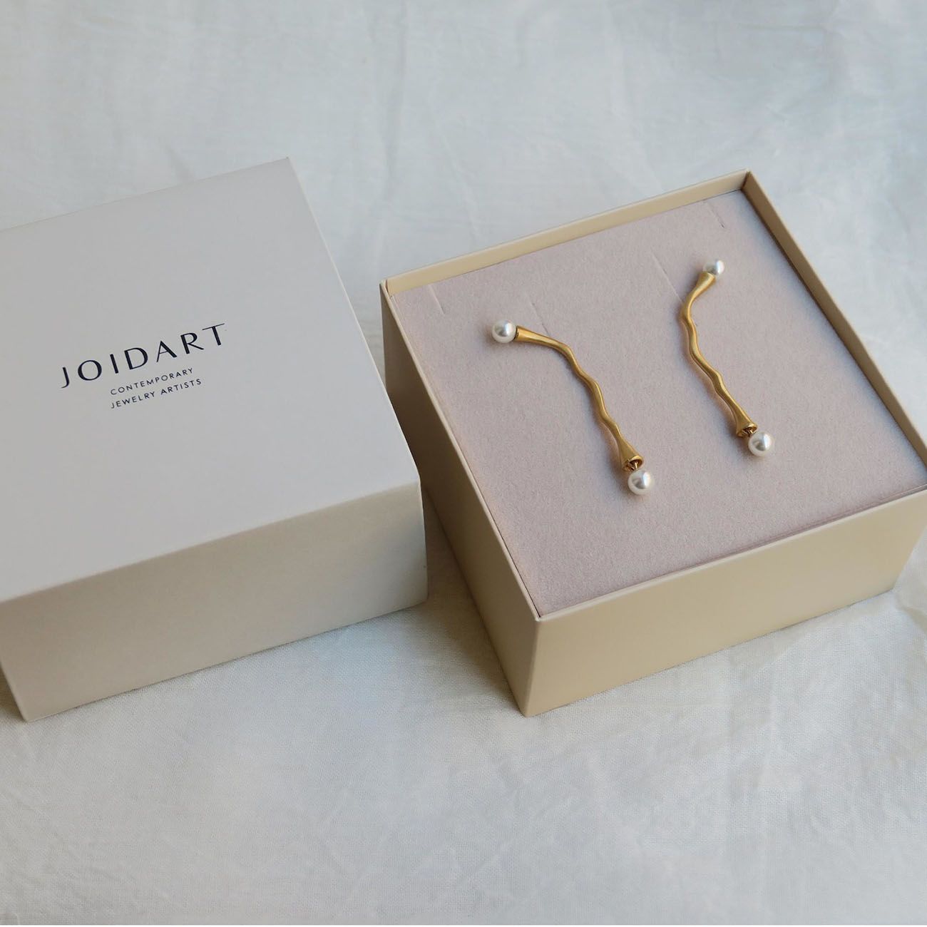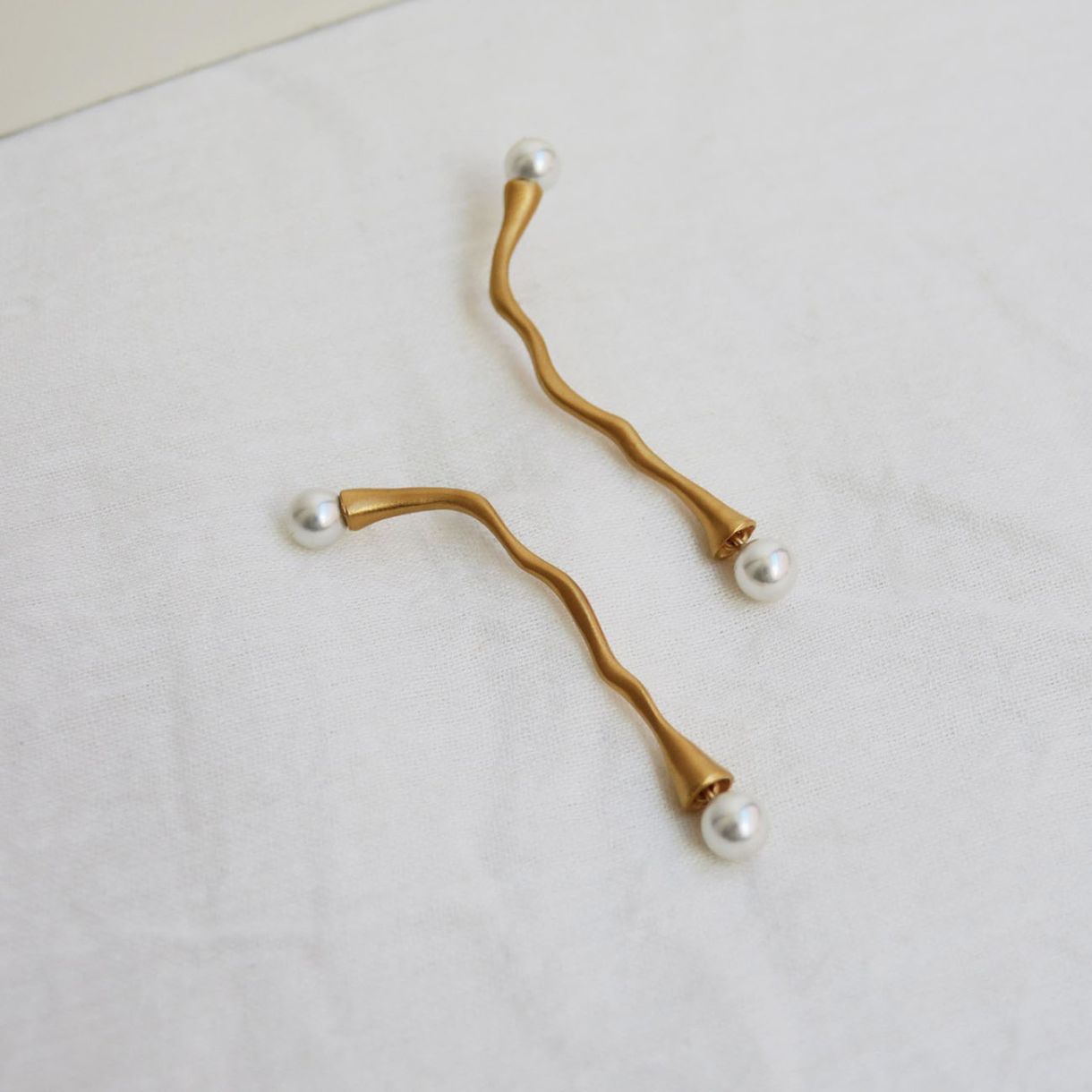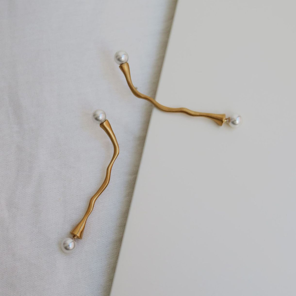 Дълги обеци с неравна повърхност, с ръчно изработена перла от муранско стъкло в горния край и друга в долния. Изработено от матов метал с 24-каратово позлатено покритие и перла от муранско стъкло на края. Закопчаване тип „омар“ и удължаваща верижка.