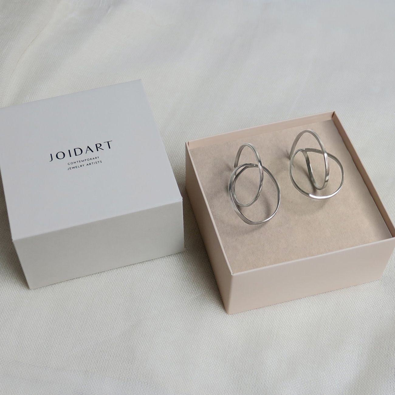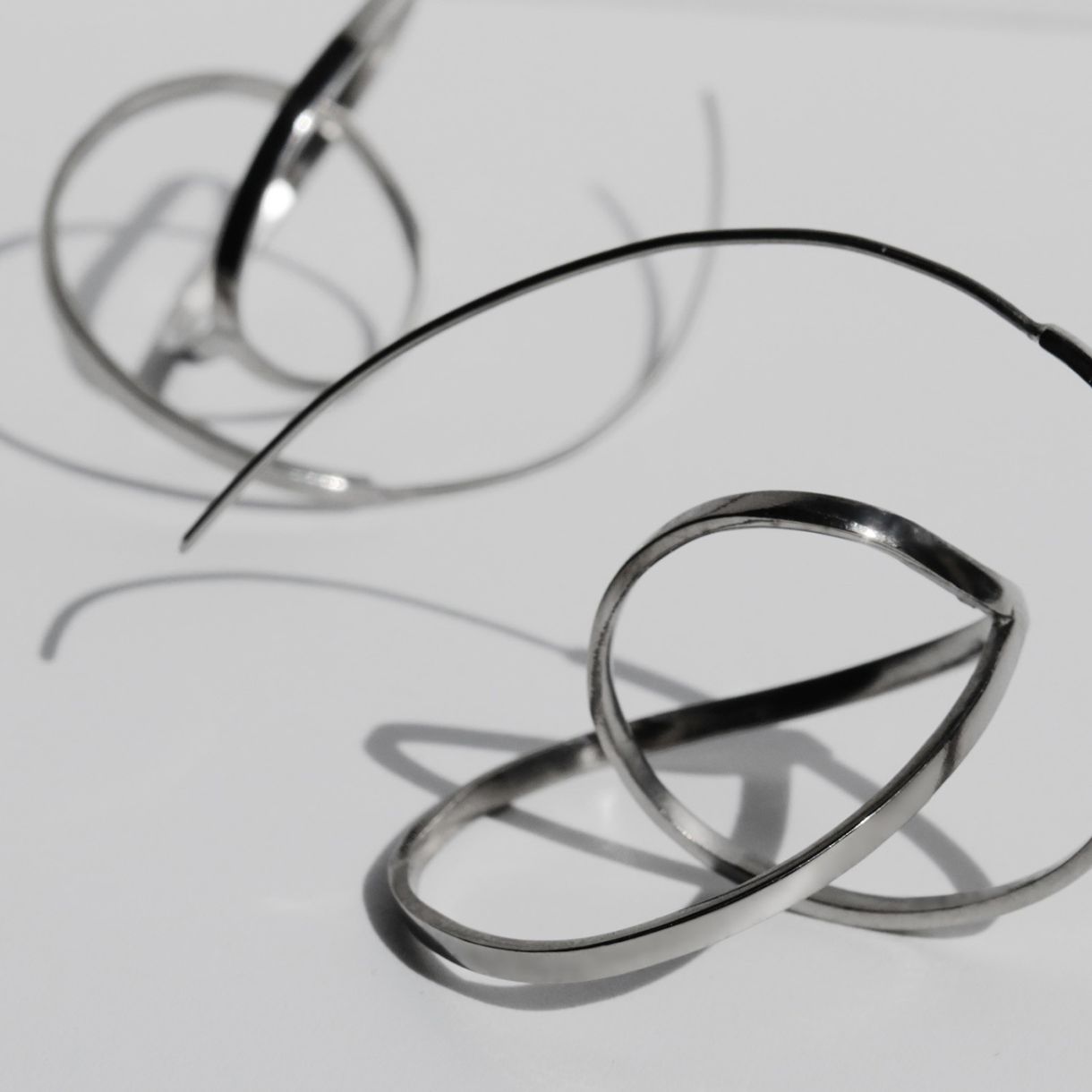 Големи блестящи обеци от сребро 925 проба с платинено покритие. Скулптурен дизайн, изработен от преплетени метални ленти. Прецизната изработка на тази колекция означава, че всяко парче е уникално по размер и форма, така че двойките може да не са симетрични.
