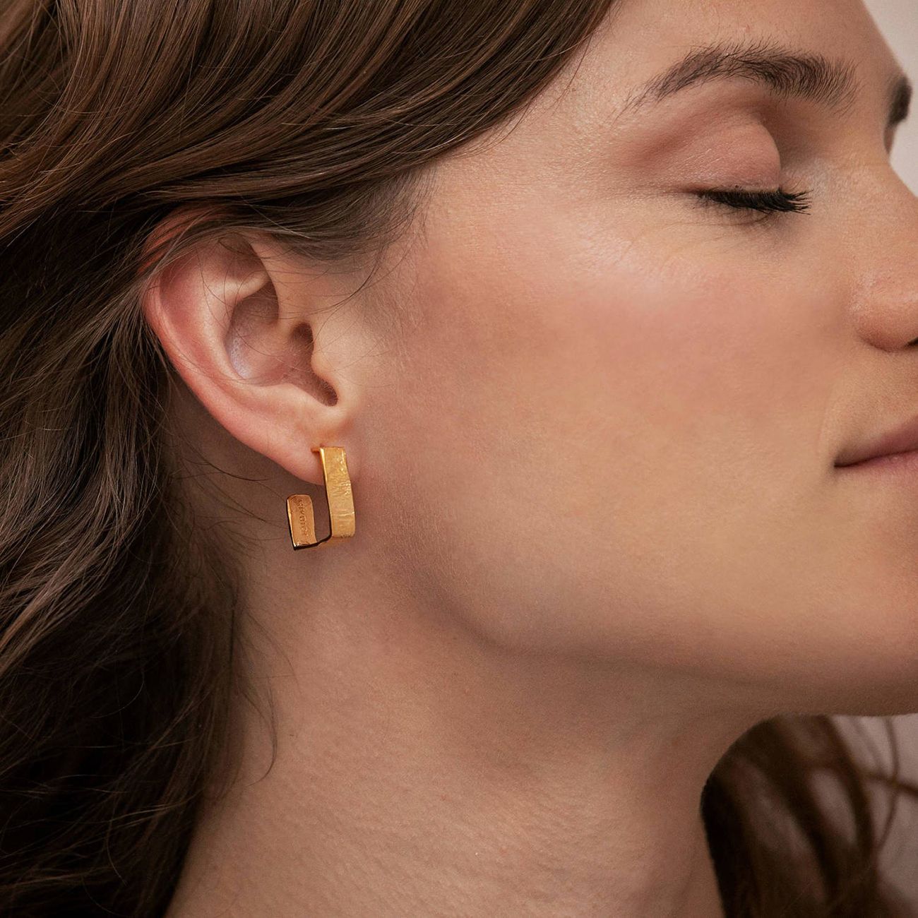 Средно големи правоъгълни обеци тип халка, във вариант от сребро или месинг с позлата 24-карата. Широк дизайн (0.6 см) с текстури, напомнящи кората на някои средиземноморски дървета. Закопчаване тип „пеперуда“
