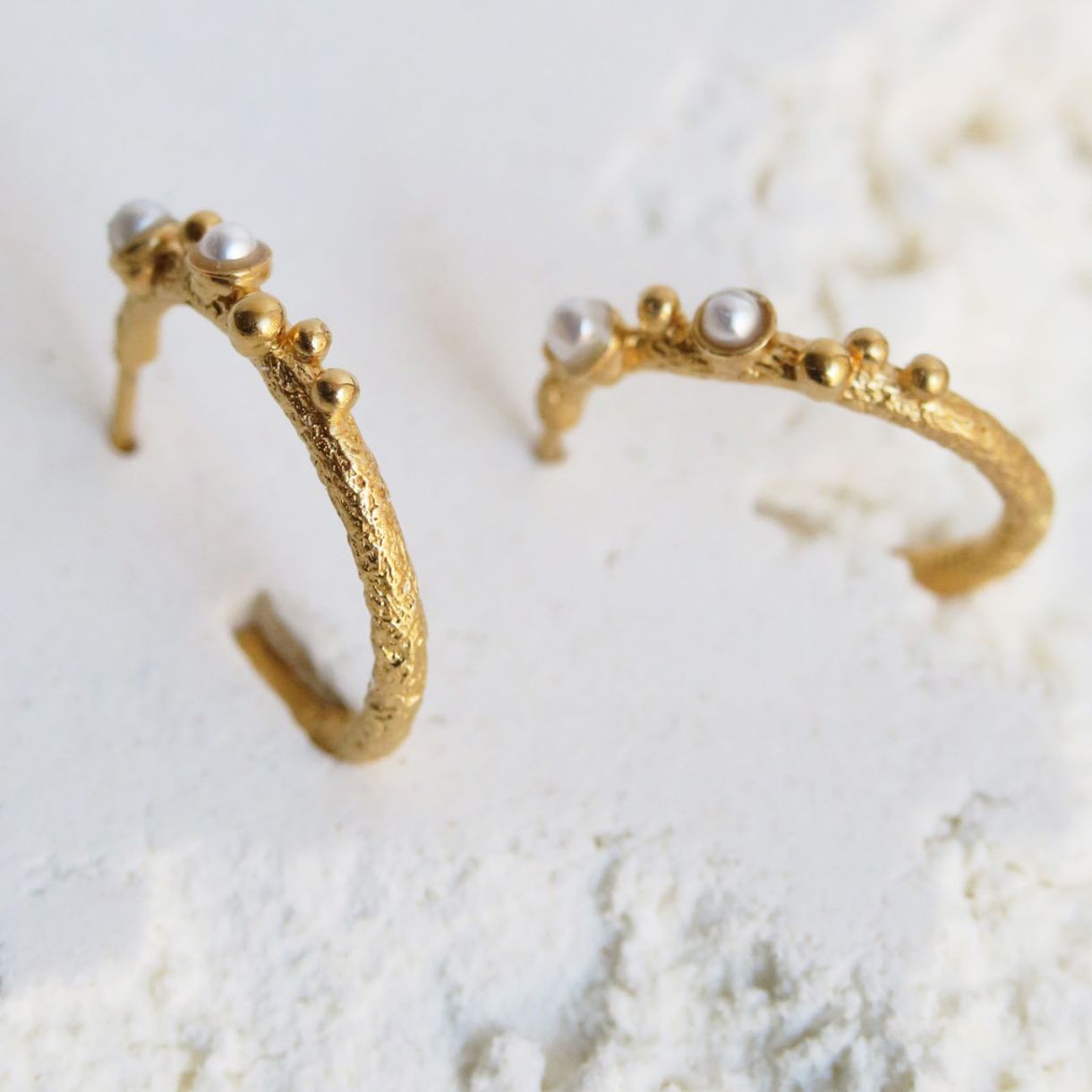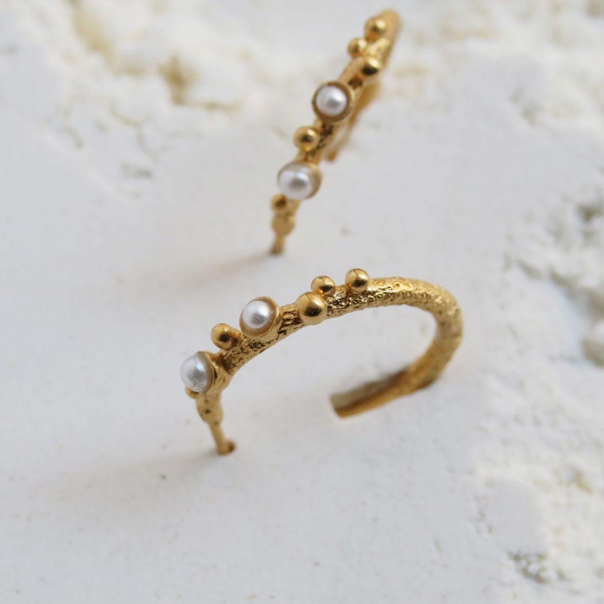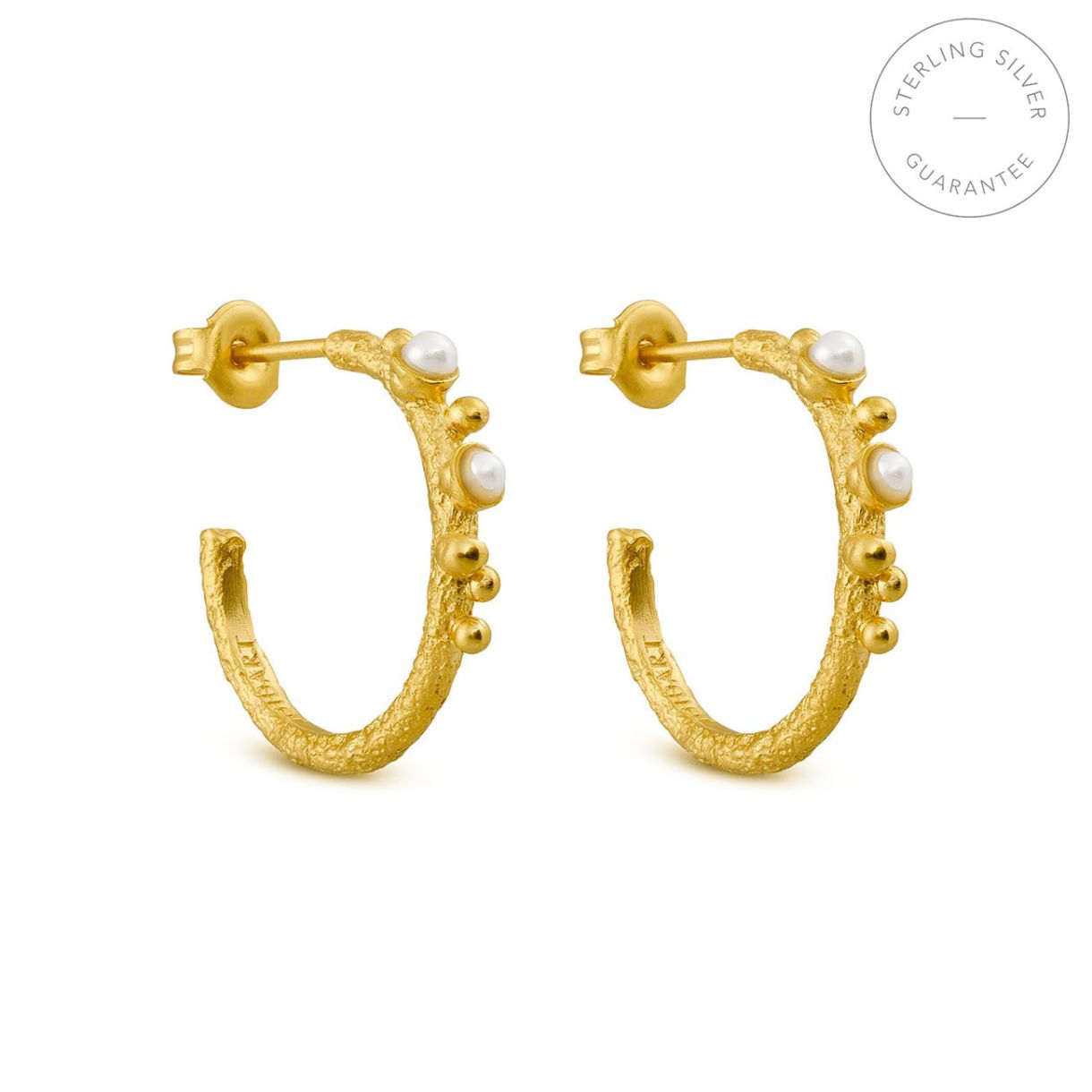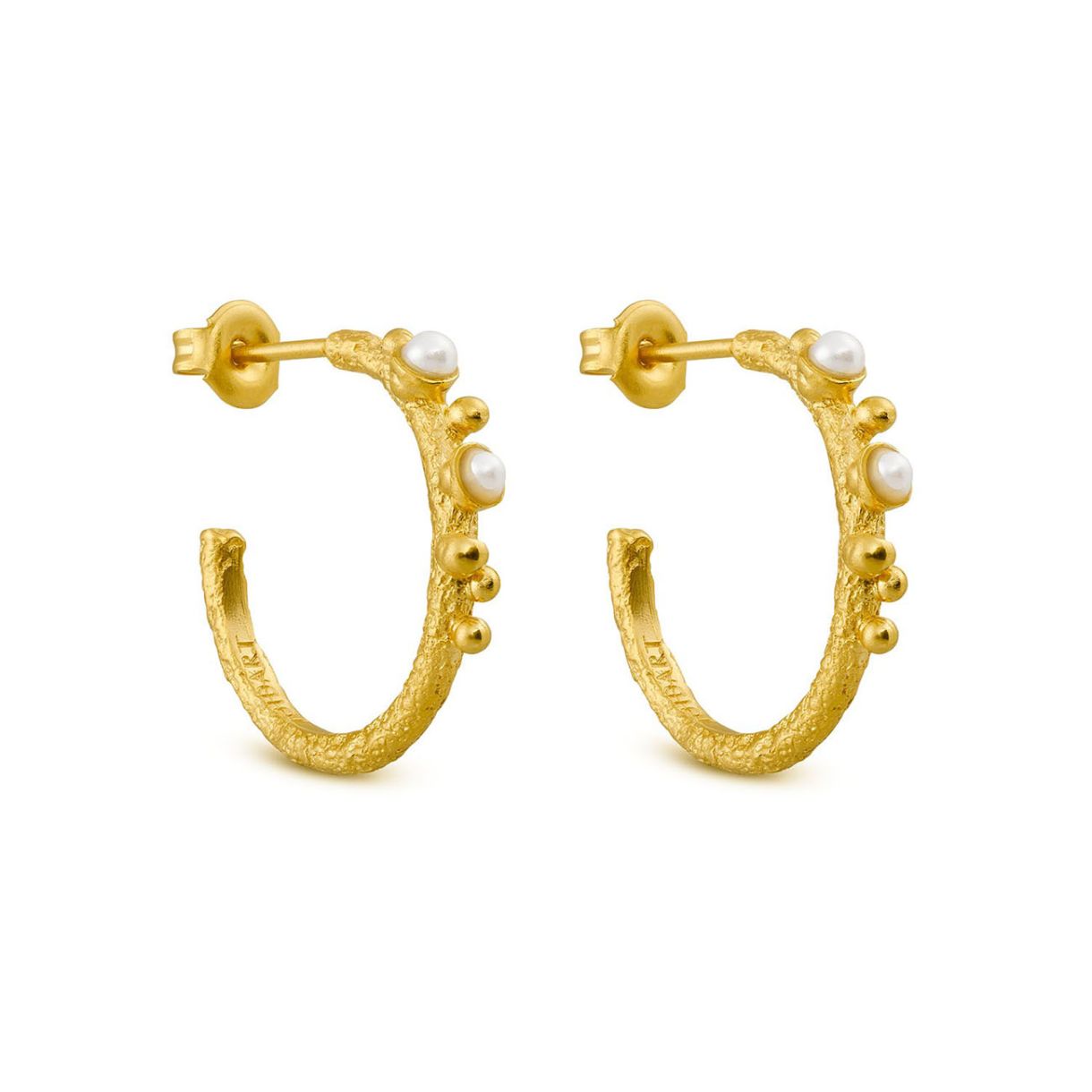 Кръгли, елегантни златни обеци Детайли от метални топчета и нежни перли на основата на смола улавят експлозия от щастие. Закопчаване тип „пеперуда“. Изработен от сребро 925 с 24К златно покритие.