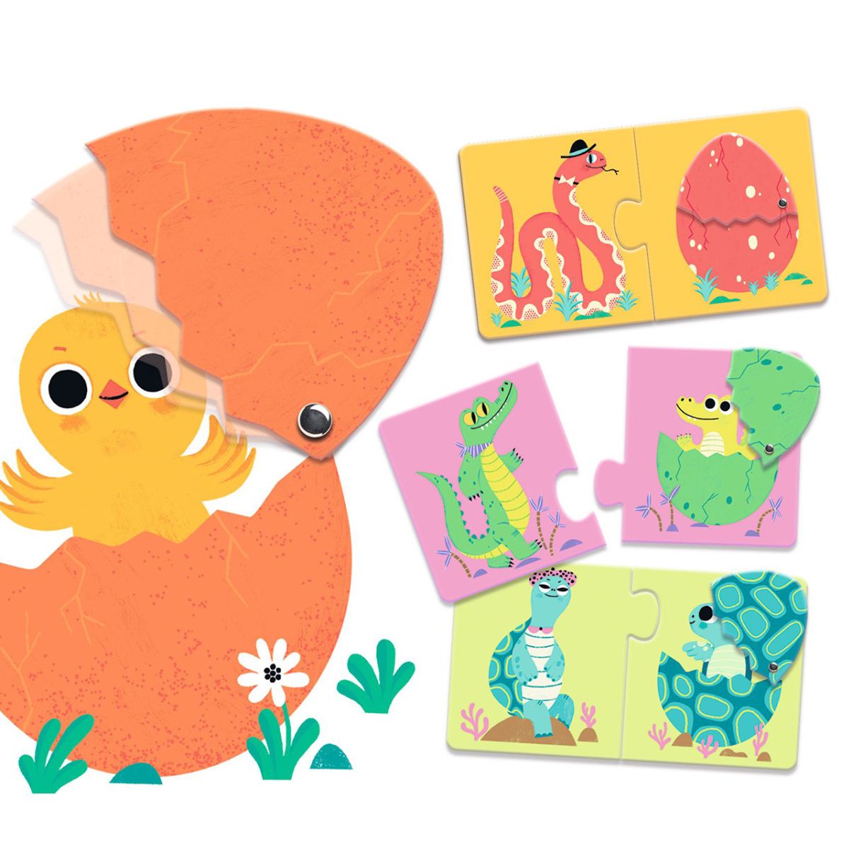 Забавен образователен пъзел, в който децата свързват животното с яйцето му, разкривайки скритото вътре бебе: изненада! Пъзели от две и три части и забавни и прости игри с асоциации за деца на 2 и повече години.