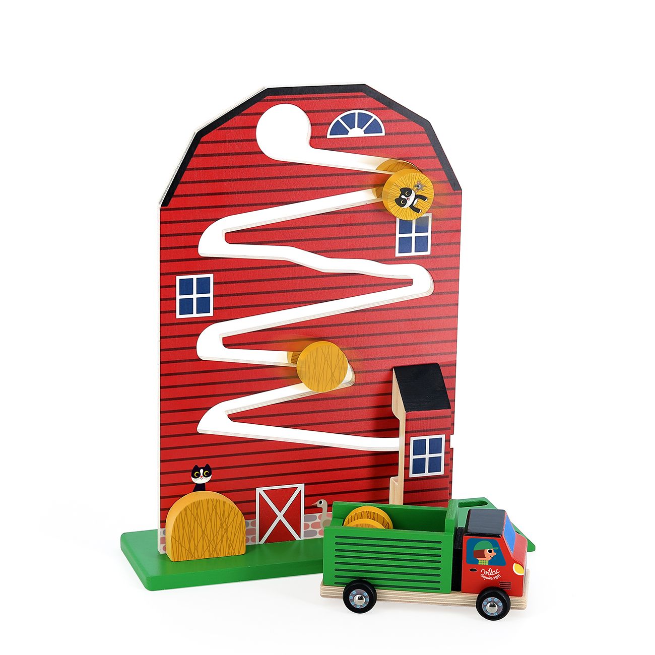 Време е да съберем сеното! Подарете на детето си тази оригинална дървена игра за развитие, илюстрирана от художничката Ингела П. Аррениус. Подходяща за деца от 18 месеца, тази игра стимулира моториката и въображението, като спускате балите сено до малък камион. Забавна и образователна, тази игра кани вашето малко дете да открие понятието за причина и следствие, докато се забавлява в един цветен и творчески свят на фермата.
