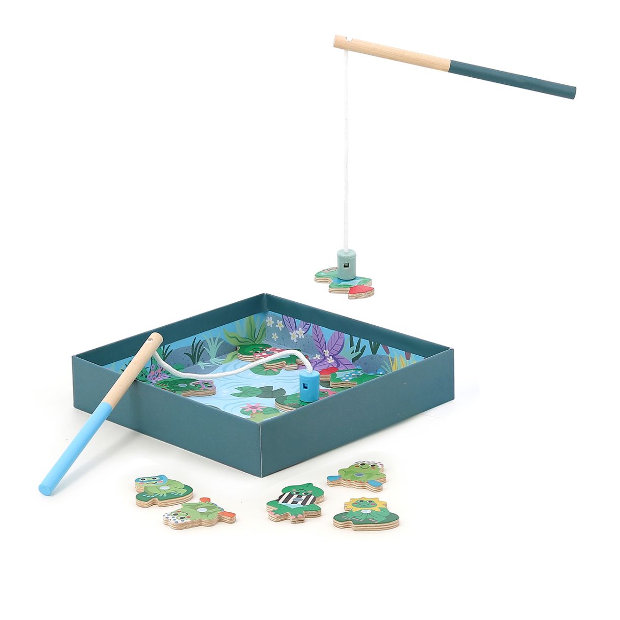 Риболов с въдица, да, но не с риба, а с жаби! Влюбете се в нашите малки дървени жаби, изрисувани с чувство за хумор от Мишел Карлслунд. Вашето дете, въоръжено с дървена въдица, ще трябва да се справи с едно голямо предизвикателство: да хване всички жаби! Общо 12 очарователни и цветни жаби за улавяне. Малко екстра: на гърба на фигурките са отбелязани точки. Когато играете в двойка, този, който събере най-много точки, печели играта.