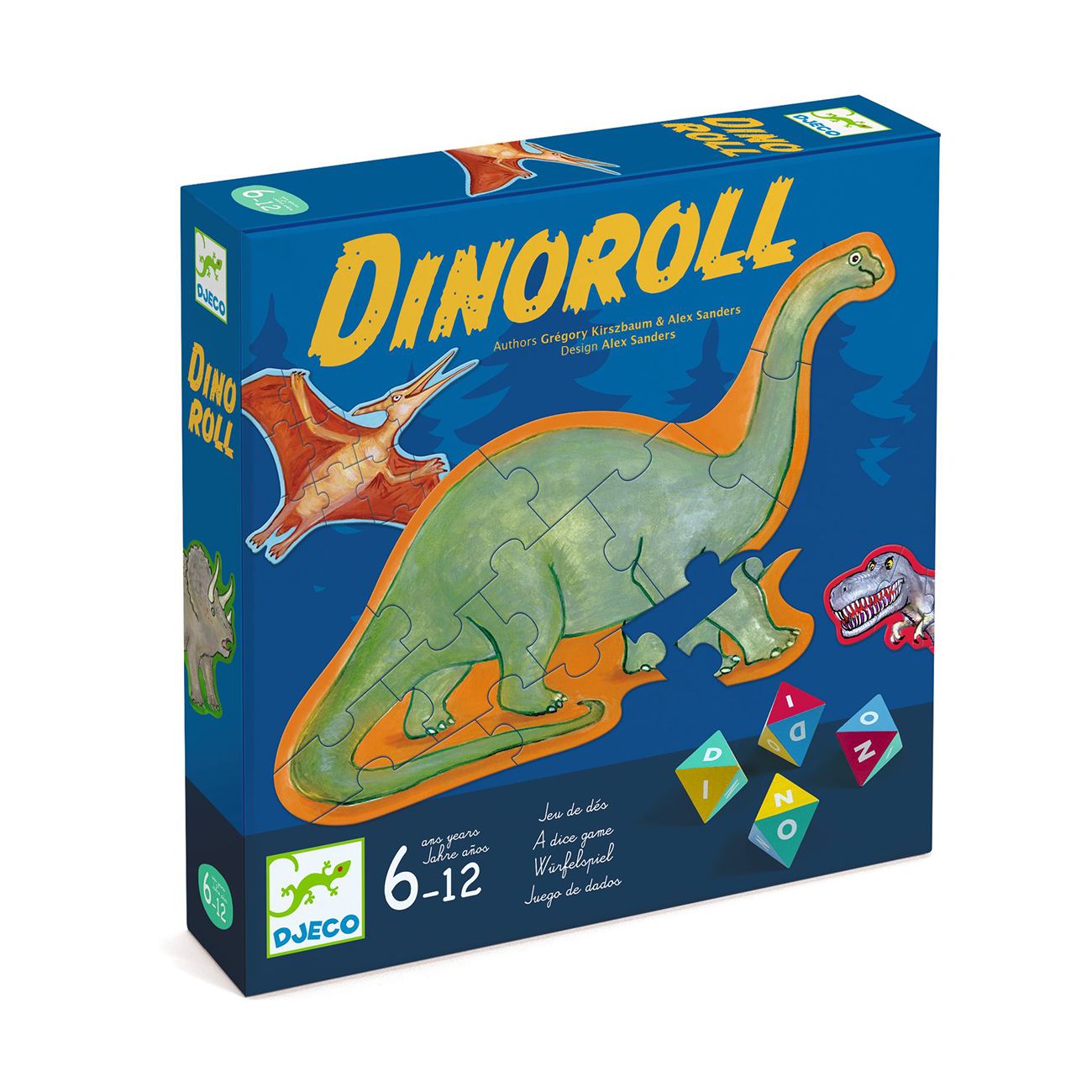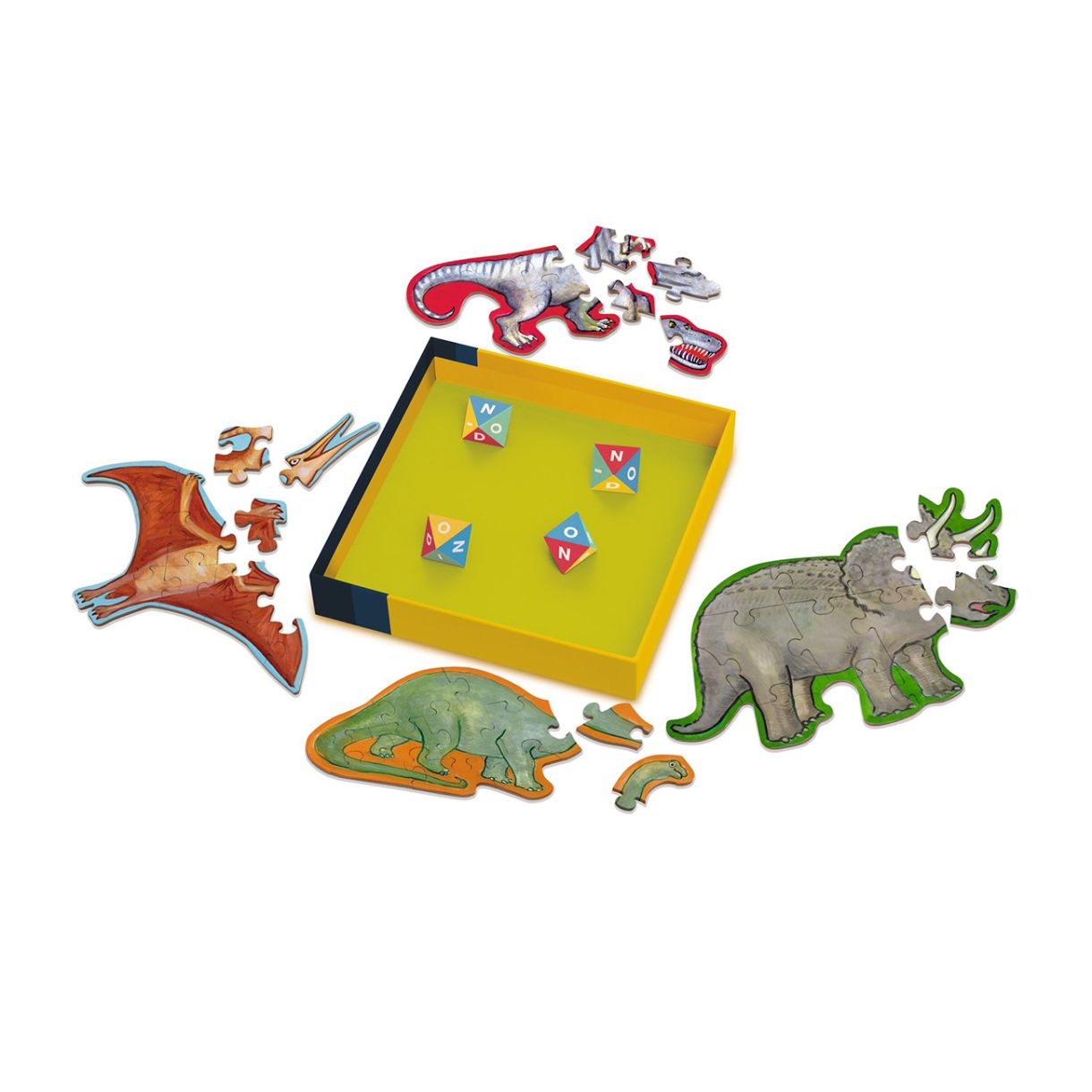 Имате 4 хвърляния, за да напишете „DINO“ с тези забавни осемстранни зарове и да сглобите свой собствен пъзел с динозаври. Игра със зарове, подходяща за цялото семейство – дори за по-малки играчи.