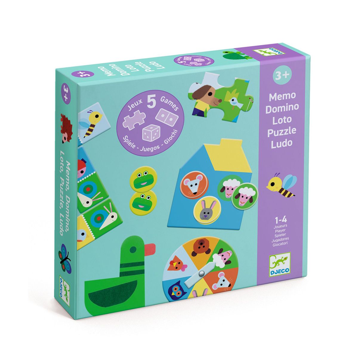 Комплект от 5 класически образователни игри: игри за памет, лото, домино, пъзел (12 части) и игра с търкаляне и преместване: децата ще се забавляват, докато развиват логическото си мислене, паметта и наблюдателността си.