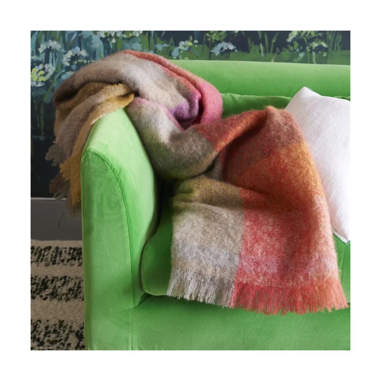 Вдъхновен от една от любимите ни тъкани на тапицерия, това многоцветно одеало е изтъкано от плътна, богата на вълна мека прежда.  Богата на цвят и текстура. Завършен с ръб с ресни.