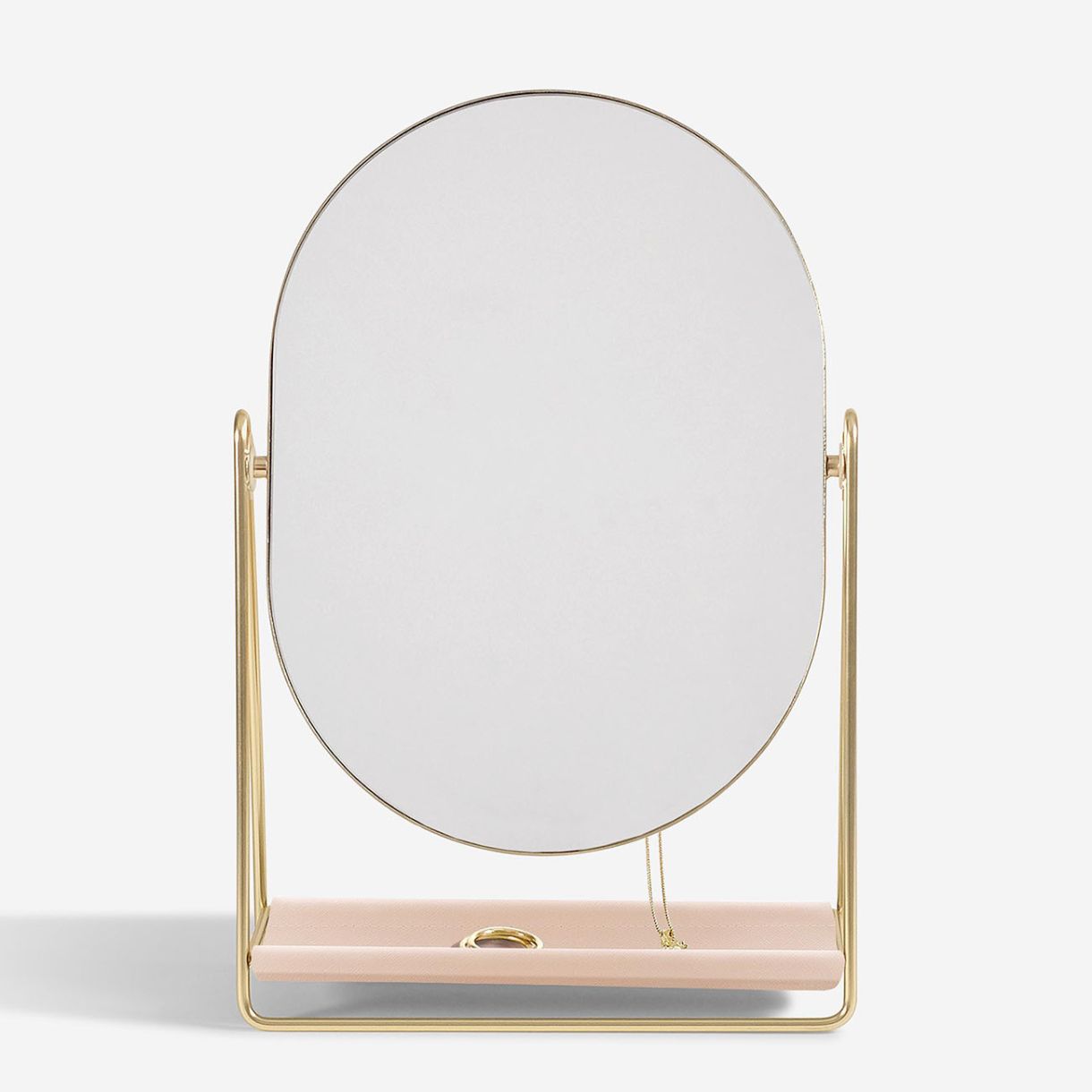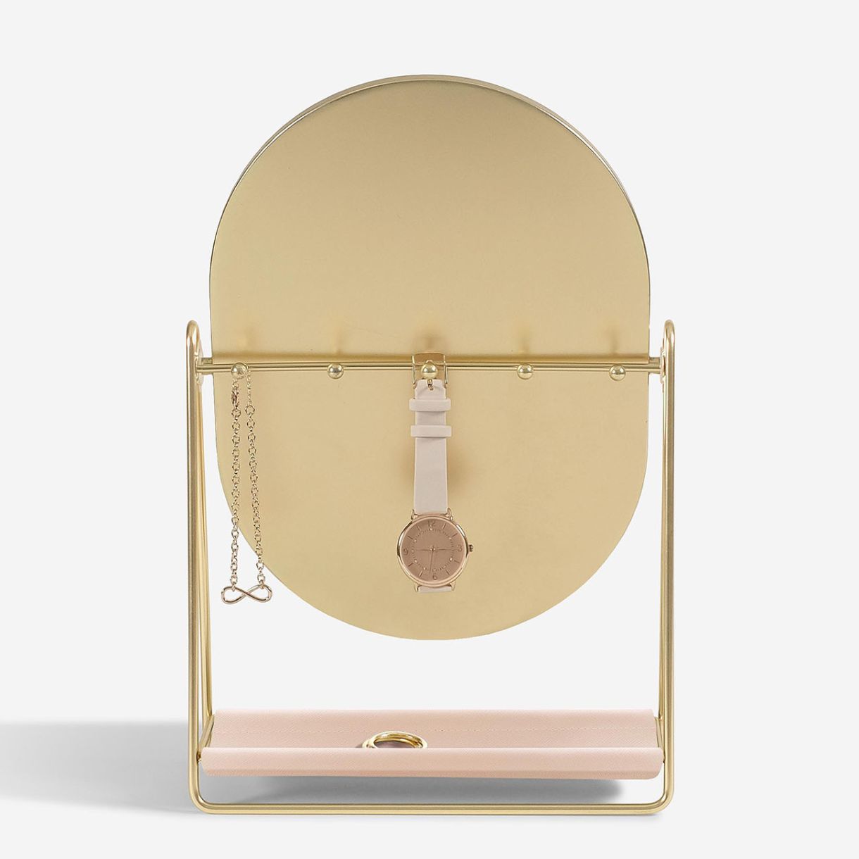 Разполага с голямо огледало отпред, поставено върху метална рамка, която позволява на огледалото да се накланя според вашите нужди. На гърба има и скрити кукички за бижута, за да държите ежедневните си бижута лесно достъпни, но без усилие организирани.