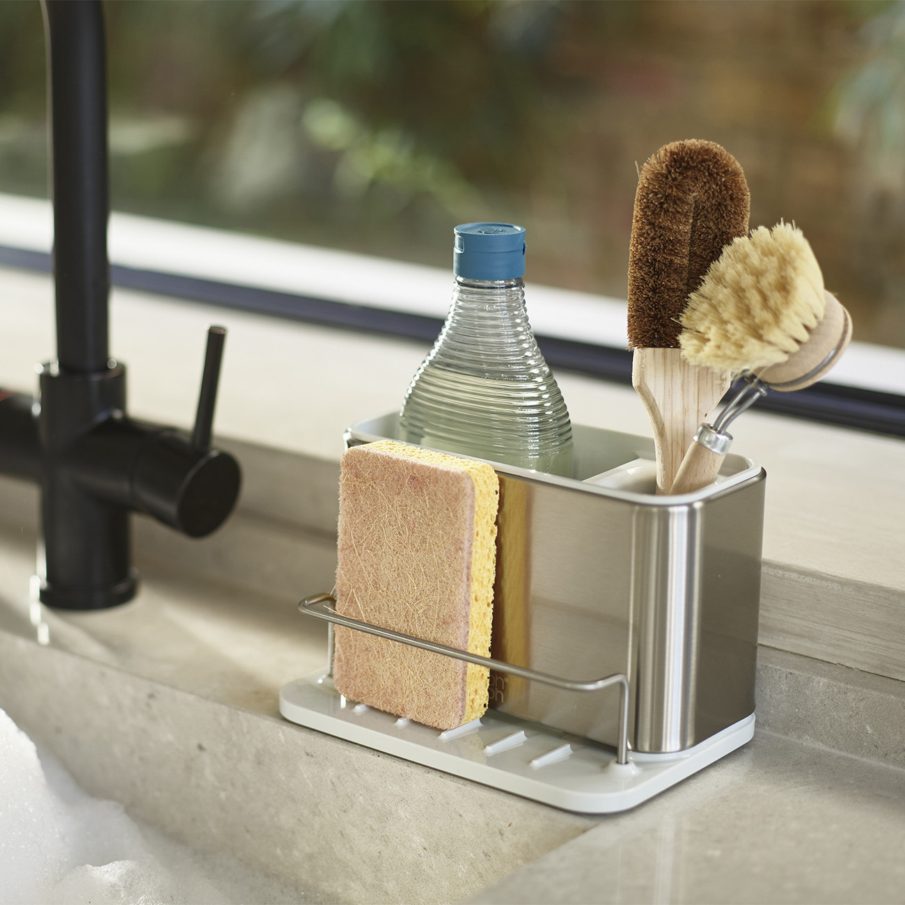 Органайзерът за мивка Surface ™  е идеален за организиране на всички принадлежности необходими за измиване на съдовете. Основното отделение е разделено на две и има достатъчно пространство за препарат и четка за миене. В предната част на органайзера има място за съхранение на гъба и тел за миене.